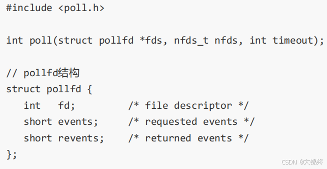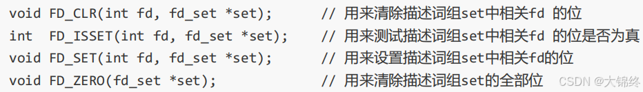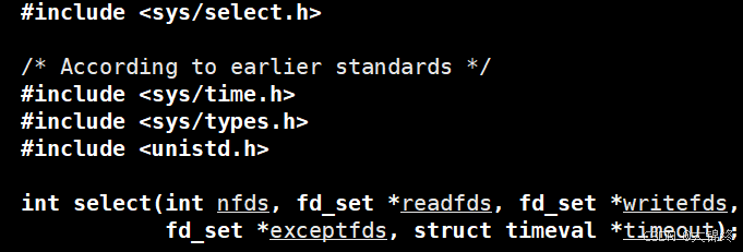 - 参数nfds是需要监视的最大的文件描述符值+1;因为文件描述符从0开始计数,所以需要n+1位才能覆盖需要监视的n位,可通过数组下标来理解