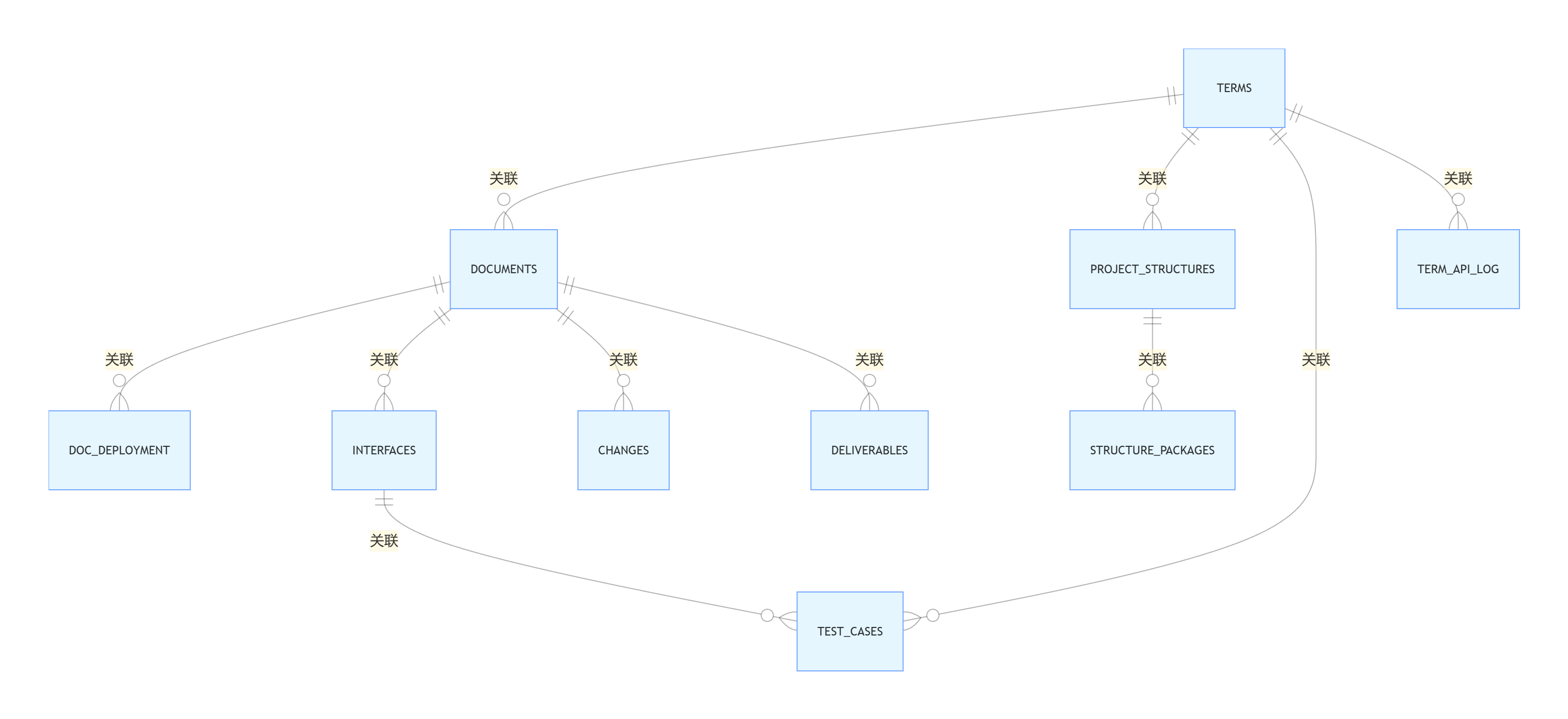 接下来,数据模型部分,之前已经有了基础模型,现在需要补充扩展模型的完整字段,以及模型之间的关联关系,比如结构打包记录关联项目结构,部署记录关联文档等。还要设计数据库初始化脚本,包括默认的术语数据、项目结构模板、文档模板,方便用户开箱即用。