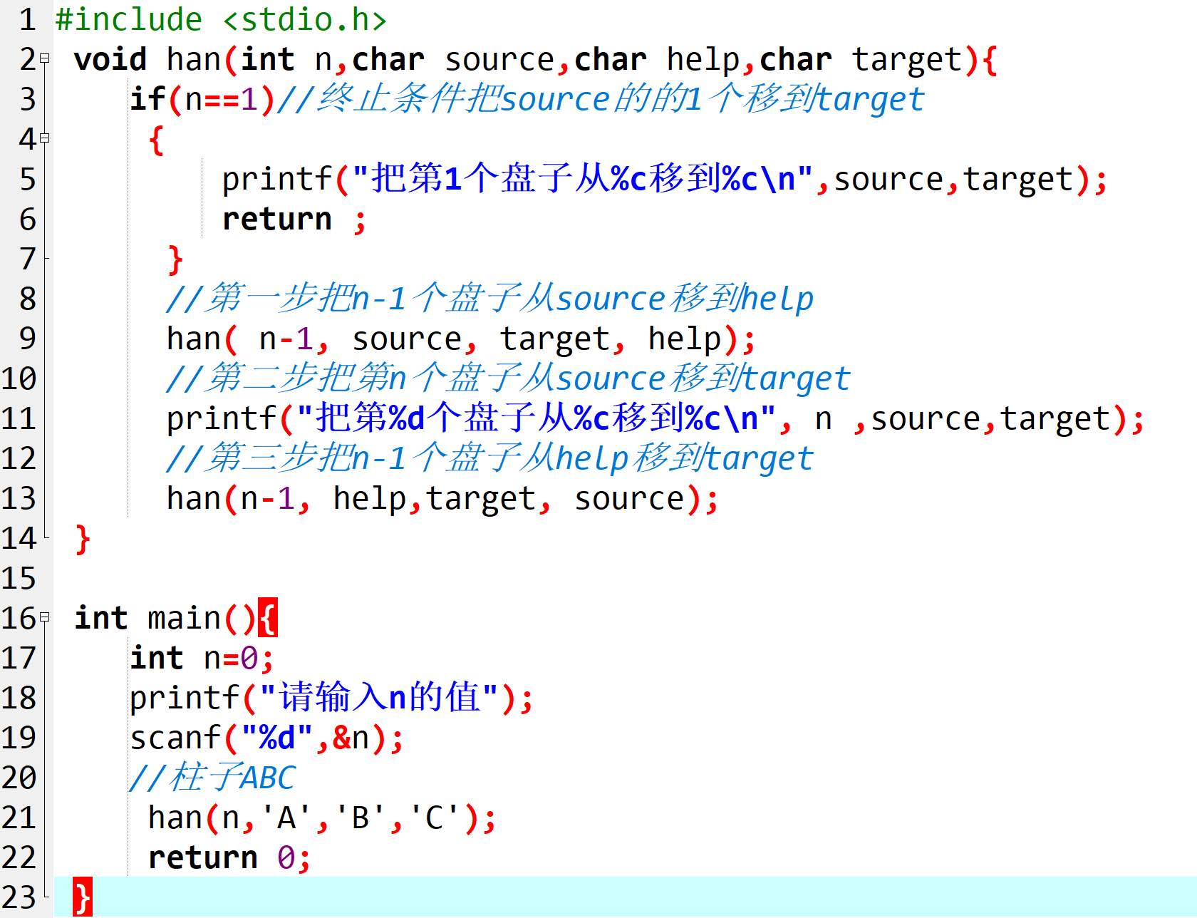 - 最后调用han(n,'A','B','C'),明确初始时源柱子是 A、辅助柱子是 B、目标柱子是 C,启动递归求解过程。