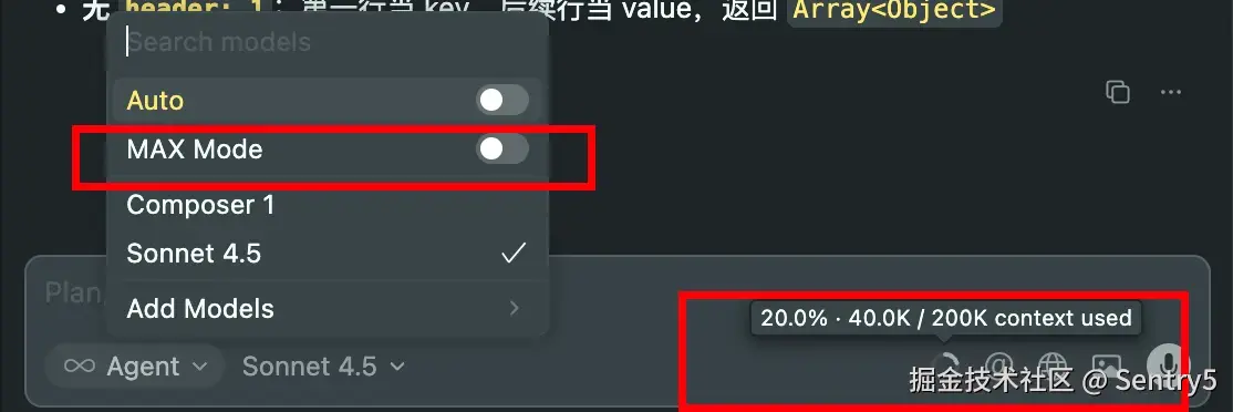 关注上下文长度: Cursor 会实时显示上下文使用情况。若接近限制,可主动选择支持更长上下文的模型,或开启多倍计费的 Max Mode 以扩展处理能力,避免上下文丢失带来的输出质量下降。