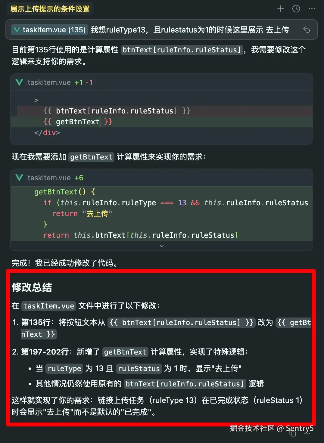 这就像一位艺术家通过AI生成画作,很难像对待自己亲笔作品那样珍视并负责。我的改进方案是:在每次 Agent 完成编码之后,阅读其改动总结;在每次提交前,仔细Review Cursor生成代码的Diff。这个过程强制我理解每一行变更,重新建立起对代码的掌控感。