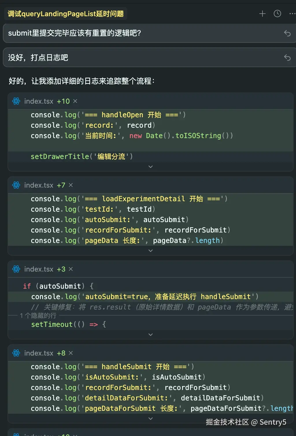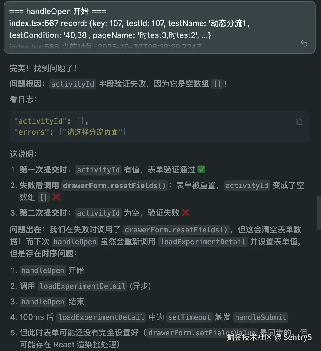 然后再将日志复制发送给cursor,神奇的事发生了,本来它改动了几遍都没能解决的问题,一下就定位到了根因: