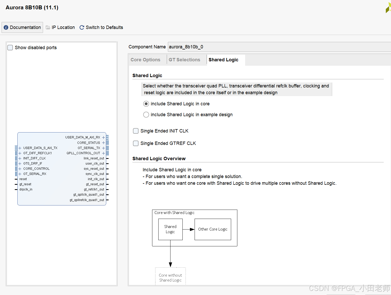 在 IP Integrator 中的行为 :当使用 IP Integrator 框图设计时,如果你放置了多个 Aurora IP 核,Vivado 会自动处理 共享逻辑。通常,第一个被放置的 IP 核会被设置为