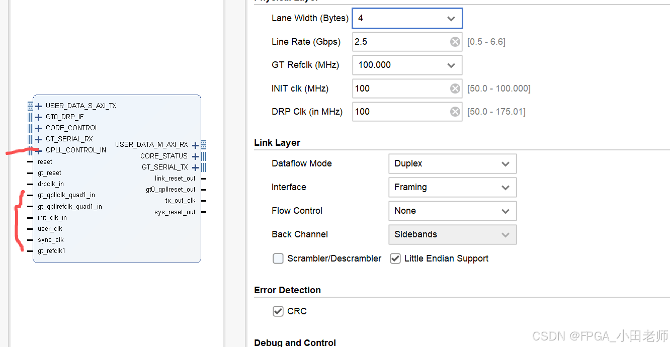 调试 :当选择 "in example design" 时,如果链路无法建立,请务必先检查共享逻辑模块输出的时钟和锁定信号(如