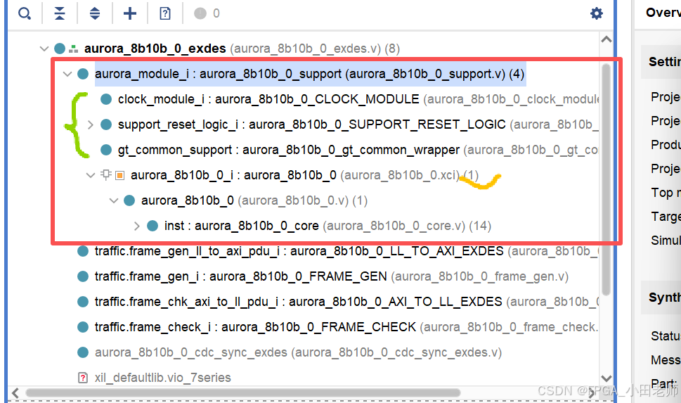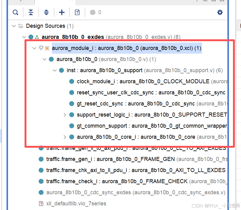 将所有共享逻辑(时钟、复位、公共模块)打包在 IP 核 aurora_8b10b_0 的内部。生成的 IP 核是一个功能完整、自包含的"黑盒子"。