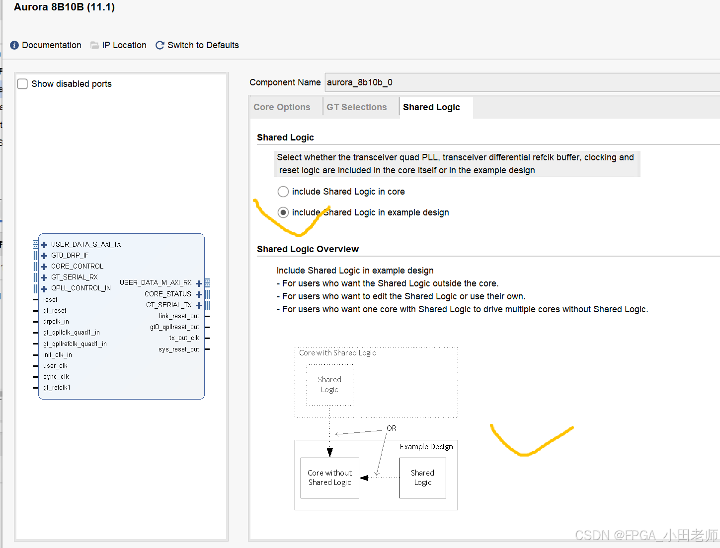 将共享逻辑从 IP 核内部剥离出来 ,放在更高一层的模块中(通常是自动生成的示例设计 aurora_8b10b_0_exdes)。IP 核本身 aurora_8b10b_0 变成一个"纯协议引擎",它需要从外部接收所有必要的时钟和复位信号。