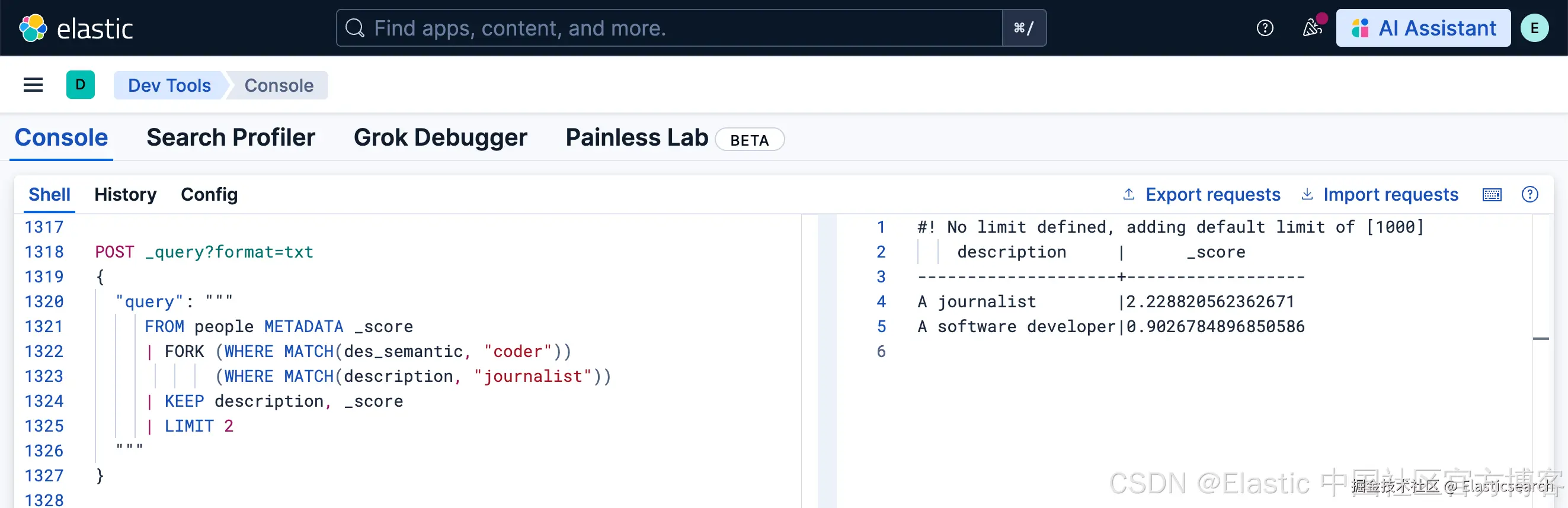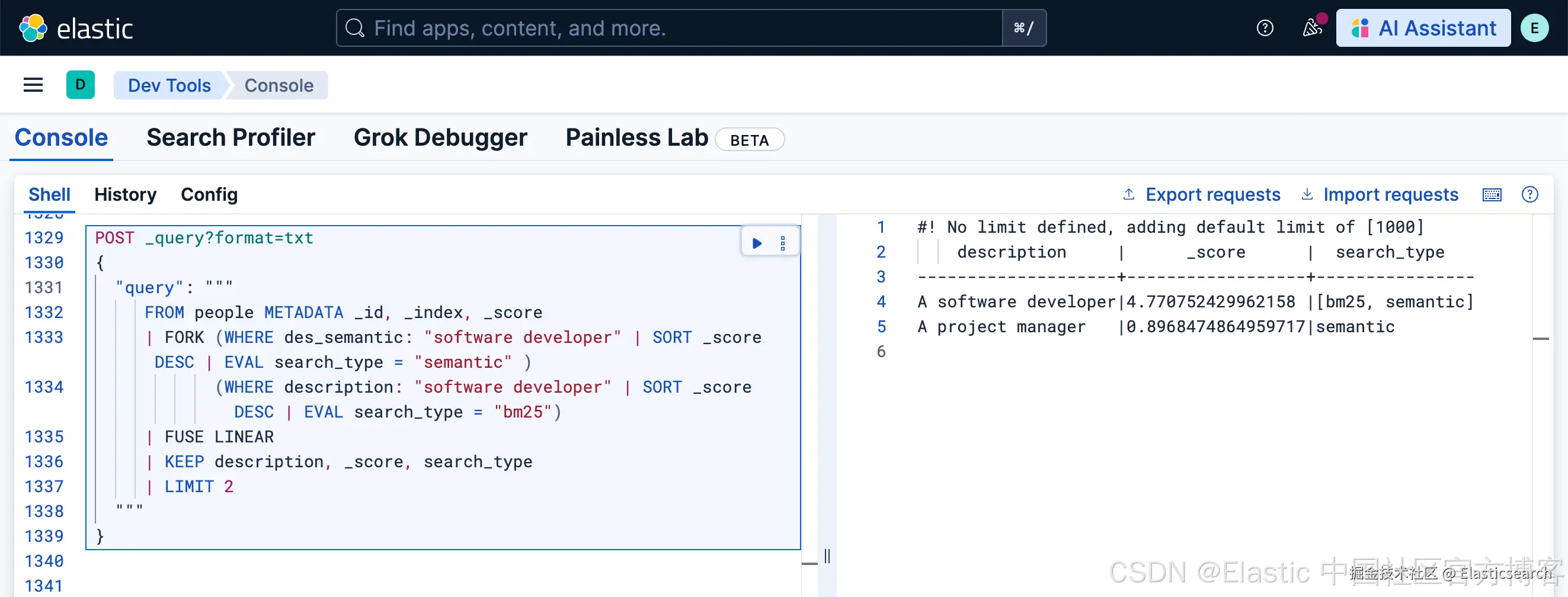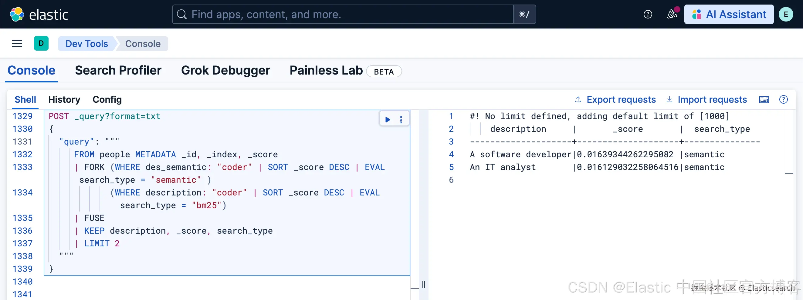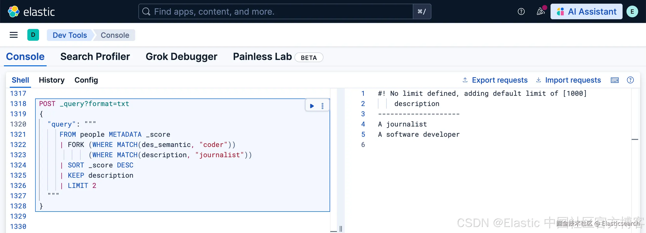 结合 FUSE 命令,FORK 可以实现混合搜索,用来合并并给多个查询的结果打分。想要了解更多关于使用 ES|QL 做搜索的内容,请参考 ES|QL for search。
