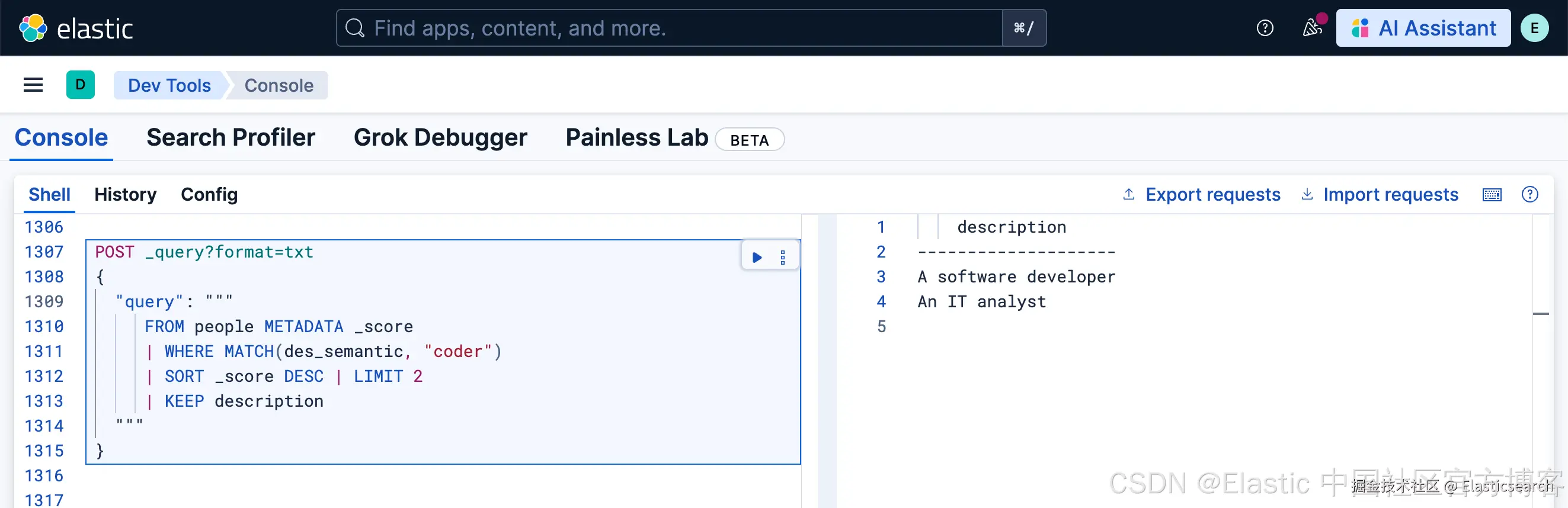 如上所示,我们的 people 索引含有一个 description 字段。它是 text 类型的。而另外一个字段 des_semantic 其实是一个密集向量。它的类型是 semantic_text。其向量值由 E3 多语言模型产生。