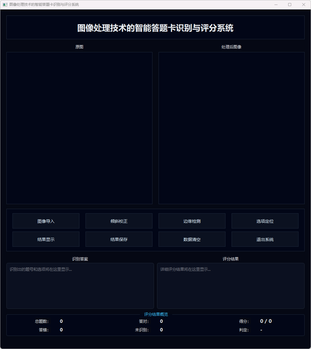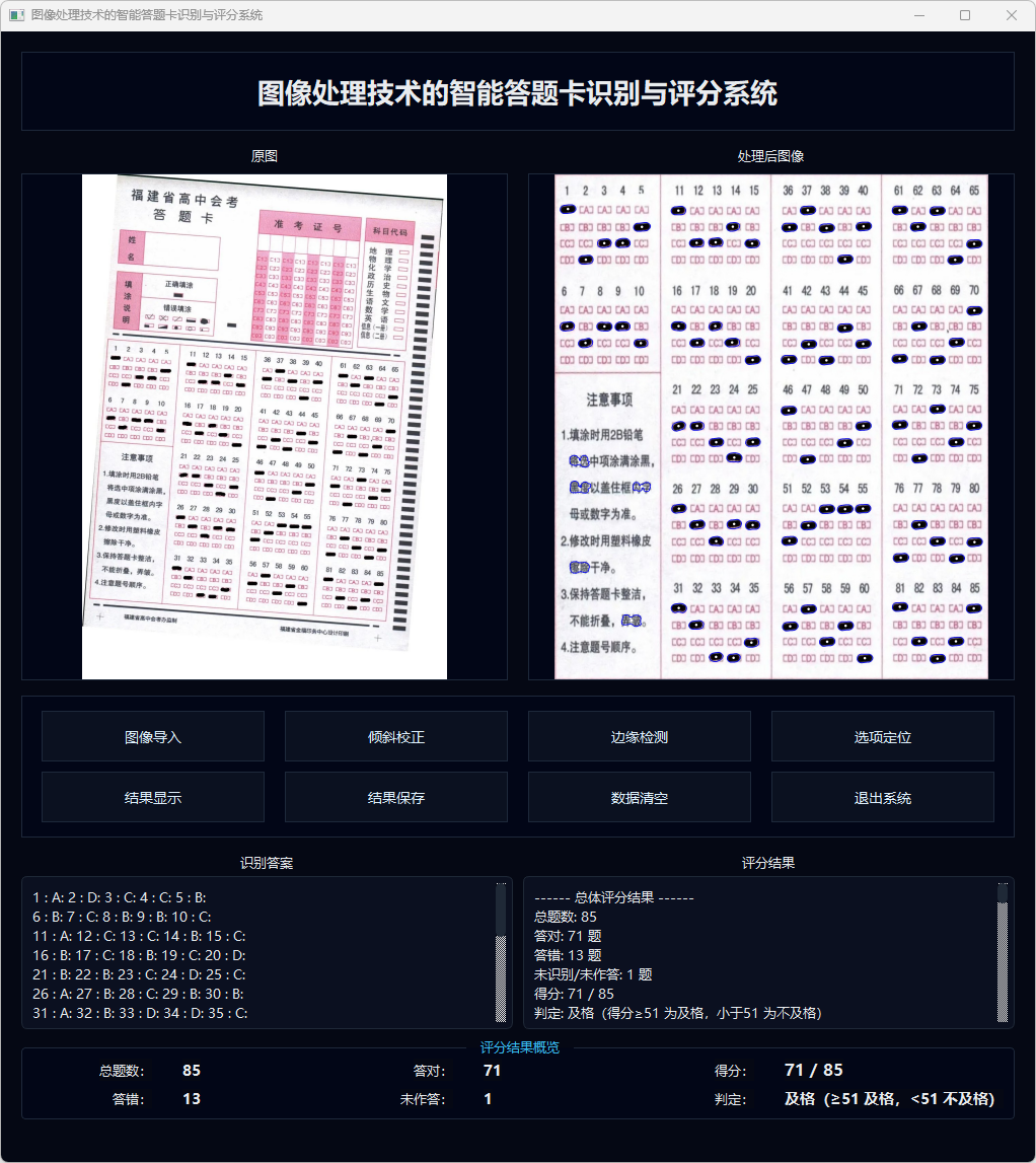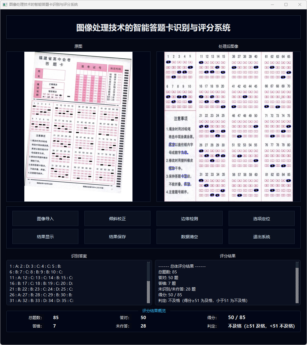 在系统实现层面,本文基于 PyQt5 搭建图形用户界面,实现图像导入、预处理过程可视化、识别结果展示及结果文件导出等功能;同时,系统支持从外部标准答案文件自动读取参考答案,对识别结果进行逐题比对与成绩统计,输出总分、错题数、未作答题数以及及格与否的判定。实验结果表明,在典型扫描或拍摄条件下,所构建系统能够稳定完成答题卡版面校正与选项识别,评分结果准确率较高,相较于人工阅卷显著提升了客观题阅卷工作的自动化程度与整体效率,具有一定的实际应用价值和推广前景。
