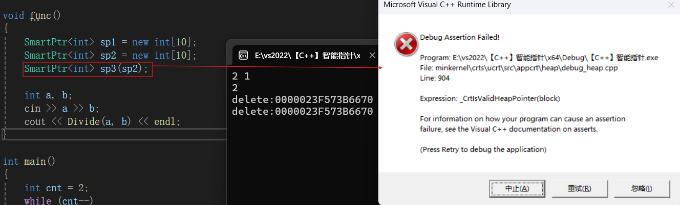 这里sp3拷贝sp2,就会导致它们同时指向同一块空间,导致析构了两次,从而程序终止。但这里和vector和string的解决思路不同,它们是进行深拷贝解决,这是因为它们里面的资源就属于它们,所以在拷贝时,它们想要获取独属于它们的一份,所以可以进行深拷贝开辟空间拷贝数据。