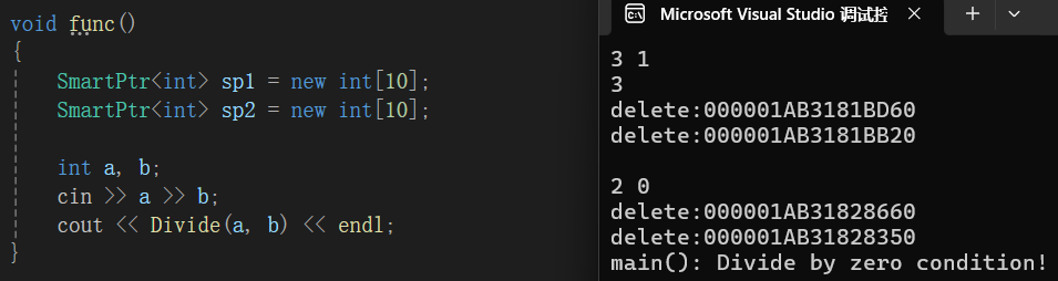 上面是我们上期博客的代码,new申请资源之后,我们也释放资源了,但我们之前因为Divide抛异常导致资源没有被释放,从而内存泄漏,所以我们需要new以后捕获异常,捕获到异常后delete释放申请内存,再把异常抛出。