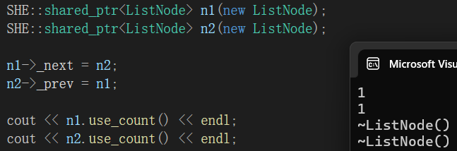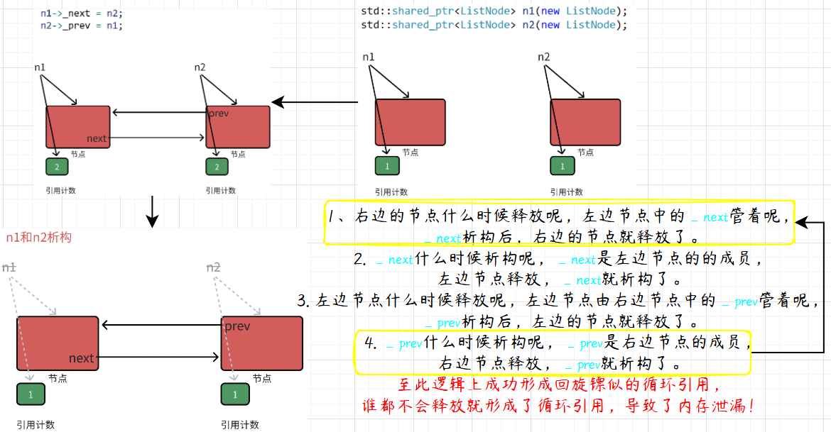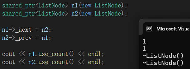把ListNode结构体中的_next和_prev改成weak_ptr,weak_ptr绑定到shared_ptr时不会增加它的引用计数,_next和_prev不参与资源释放管理逻辑,就成功打破了循环引用,解决了这里的问题。