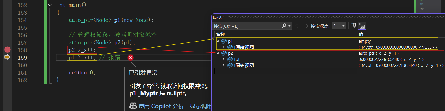 1、首先来看auto_ptr,是C++98时设计出来的智能指针,它的特点是拷贝时把被拷贝对象的资源的管理权转移给拷贝对象,这是一个非常糟糕的设计 ,因为它会使被拷贝对象悬空,导致访问报错的问题,强烈建议不要使用auto_ptr。其他C++11智能指针出来之前很多公司也是明令禁止使用这个智能指针的。