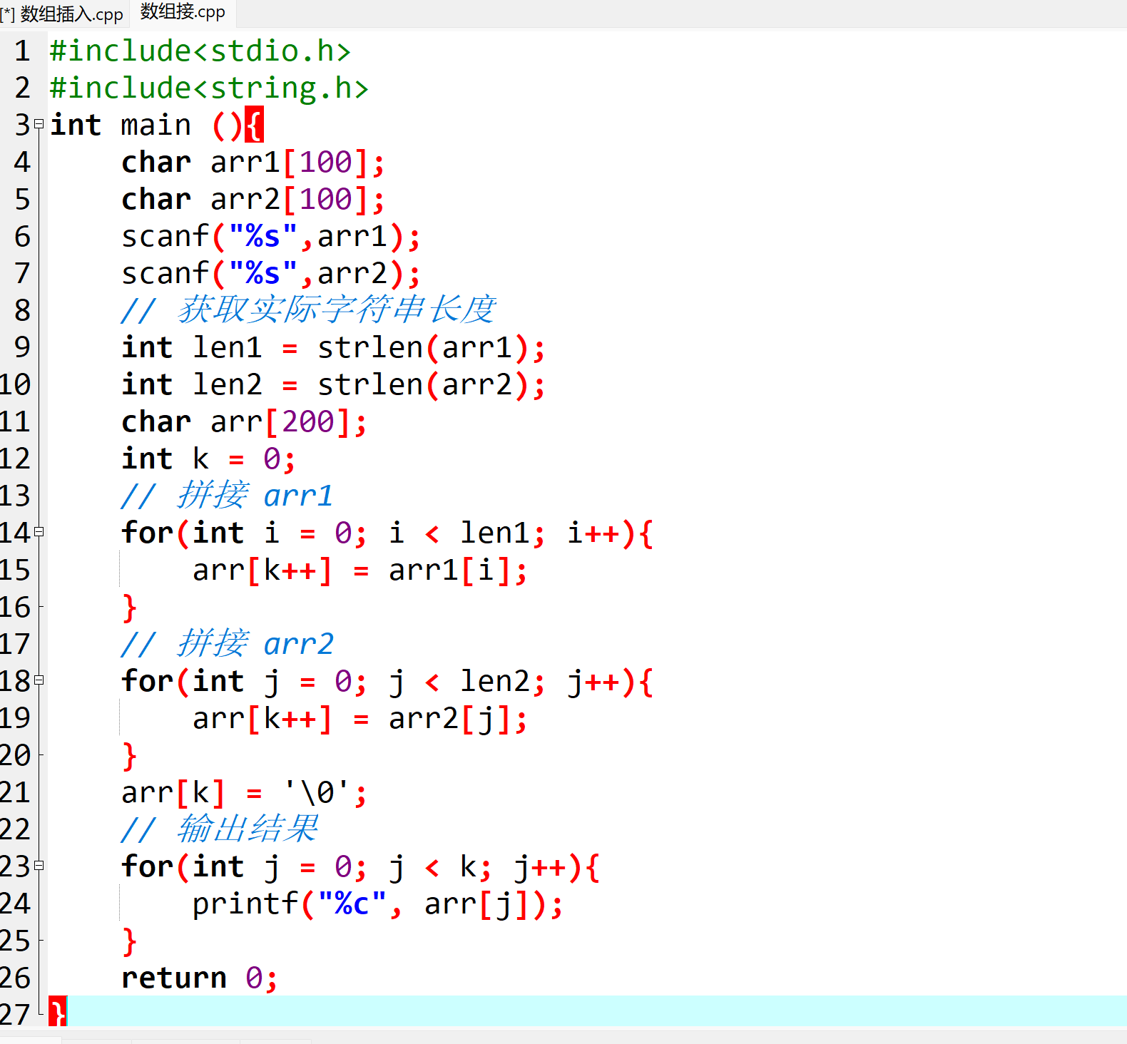 printf("拼接结果:%s\n", arr1); // 直接用%s输出,无需逐个字符打印