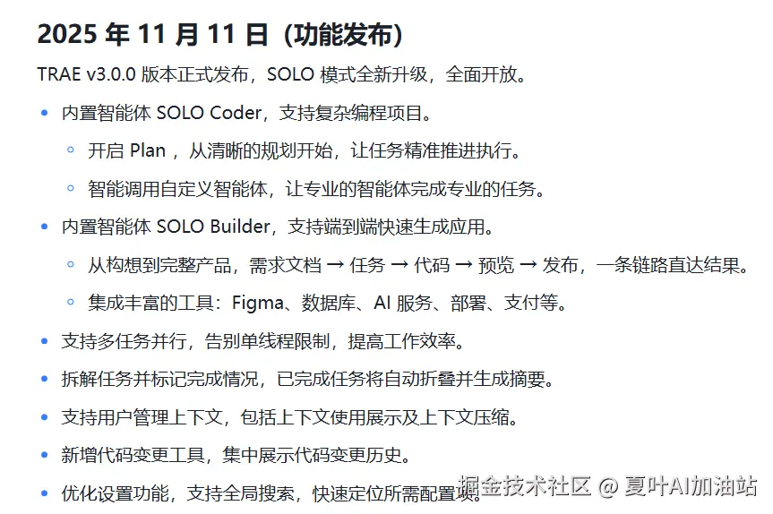 说实话,Trae国际版的SOLO内测好久了,从7月份就开始了,就在昨天,我终于收到了Trae SOLO正式版的更新--V3.0.0版本,先看下V3.0.0都有哪些更新: