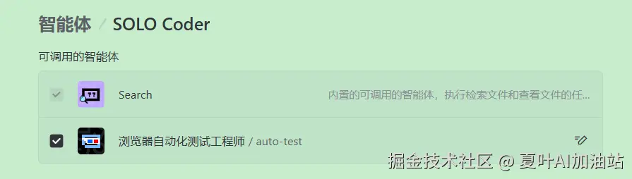 我们可以自主选择哪些自定义智能体可以被调用,也可以通过提示词来告知SOLO Coder,什么场景下调用哪个智能体。