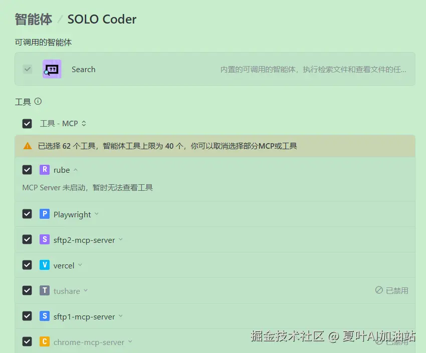 同样的,SOLO Coder还可以调用不同的MCP工具,这个在需要使用MCP工具的场景也十分有用,之前我想使用mcp的时候,还要切换到其他的智能体,现在不用了。