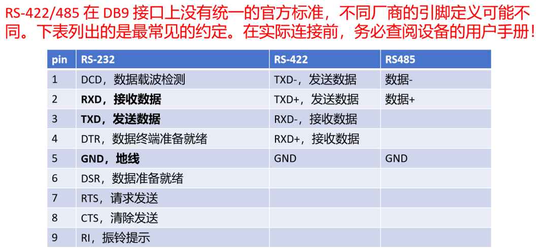 这是 RS-232、RS-422 和 RS-485 标准在最常见的 DB9 接口上的物理接口引脚定义表格: