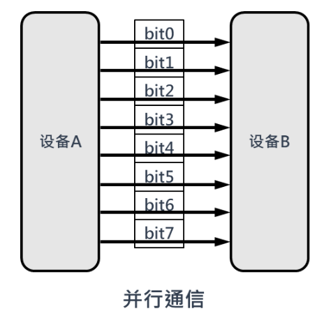 并行通信:数据各个位用多条数据线同时进行传输 (传输速度快,但占用引脚资源多)。