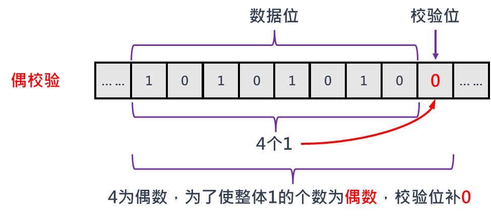 偶校验(Even Parity):通过设置校验位为"1"或"0",让传输的数据(包含校验位)中"1"的个数为偶数。