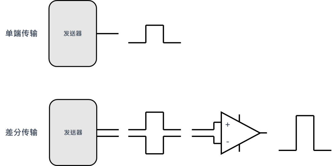 单端传输:用信号线对GND的电压值来表示逻辑"0"和"1";