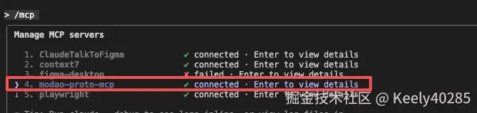 在claude控制台输入 /mcp 会出现当前安装的mcp列表,可以查看到,如果显示connected就可以。