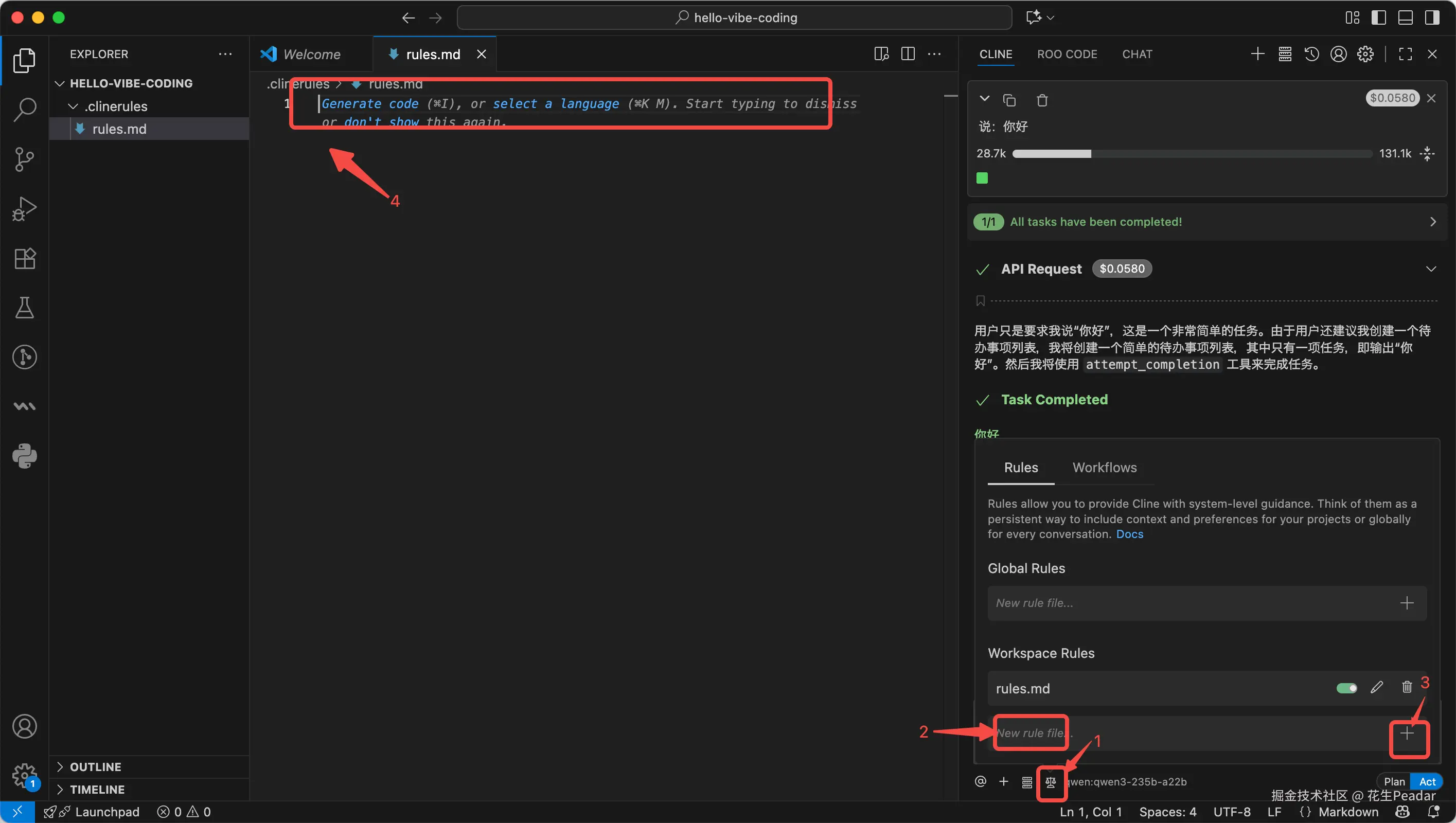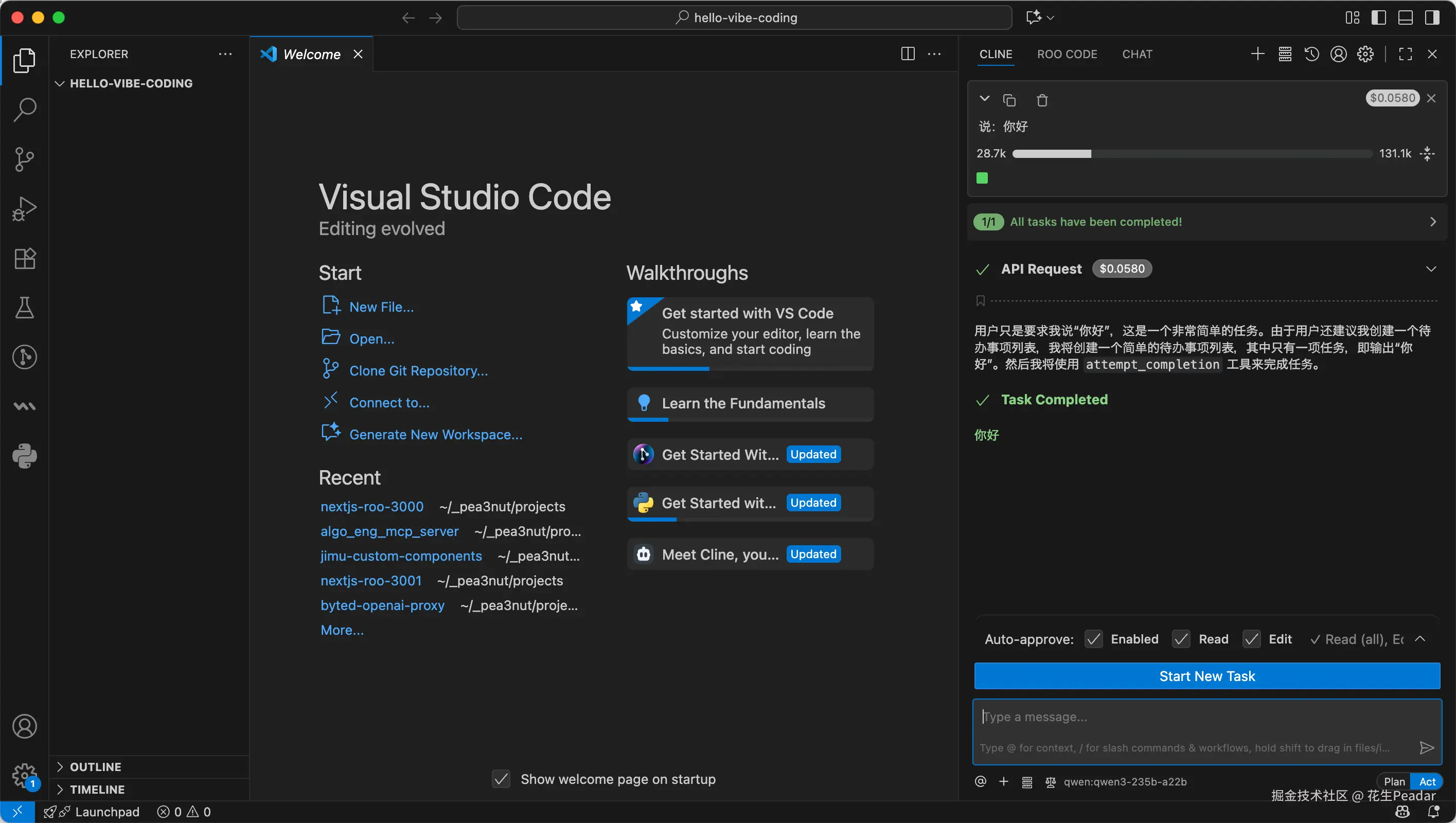| Vibe Coding 工具 | Cline | 打开 VS Code 插件,搜索 cline 安装 |