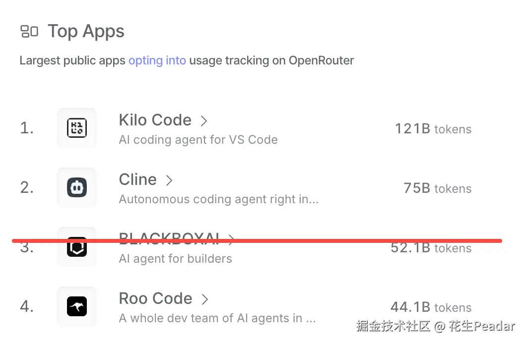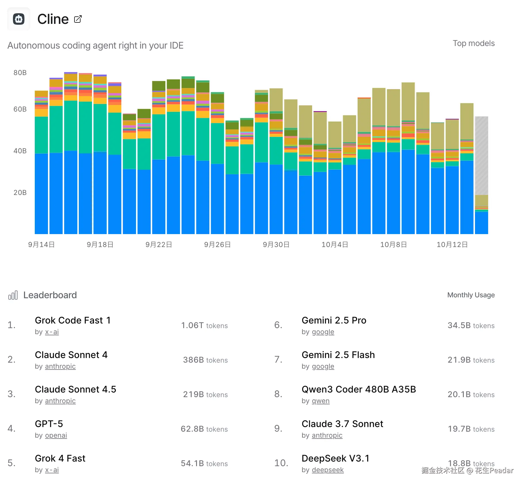 你也可以根据你使用的工具,选择最多人选择的模型。如下图是 Cline 的模型使用情况: