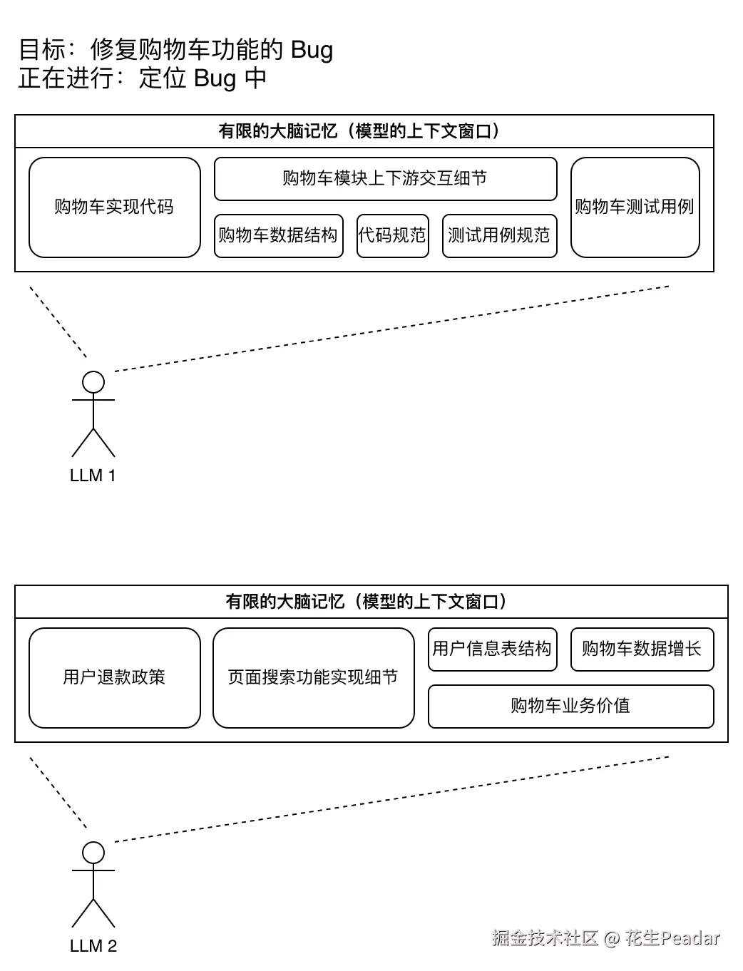 假设我们现在让 LLM 修复一个购物车功能相关的 Bug,下面有两个 LLM 和它们的上下文窗口:
