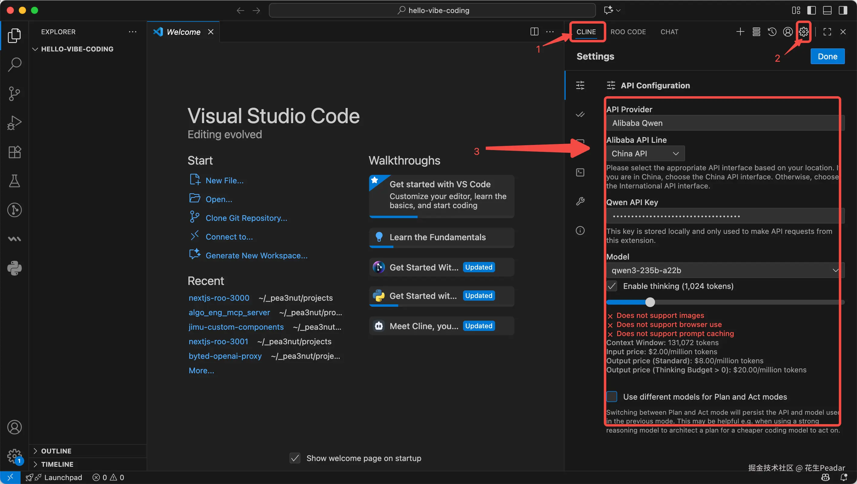 然后在 VS Code 界面打开 Cline 配置,配置如下: