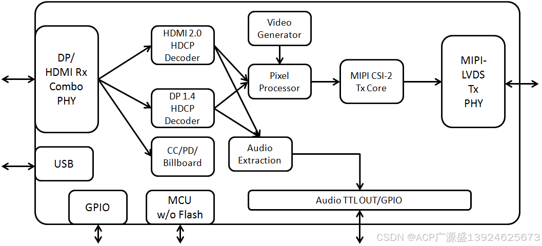 - 单芯片集成:替代传统多芯片方案(如 DP/HDMI 接收器 + MIPI 发射器 + 音频处理器),减少 BOM 成本和 PCB 面积。