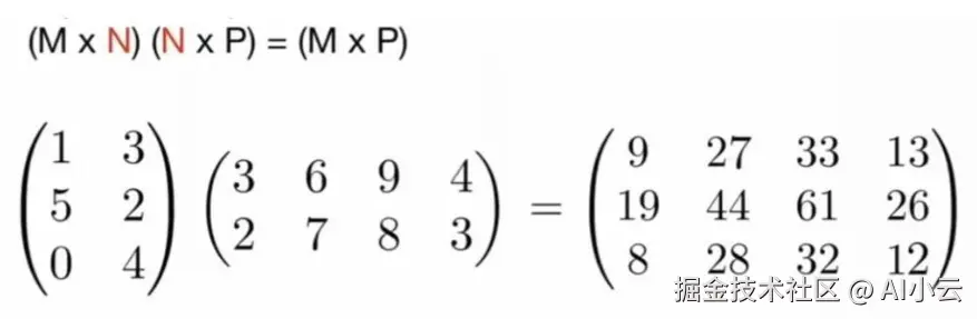 矩阵乘法规则:矩阵A的列数必须等于矩阵B的行数,才能相乘。 A(M行,N列) * B(N行,P列) = C(M行,P列), 且,A中行号i与B中列号j相同时相乘,再求和即可。