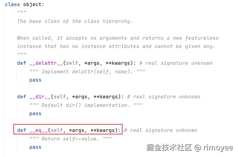 调用==来比对两个变量的值时, 调用对象的__eq__()方法(继承自object), 如下图所示