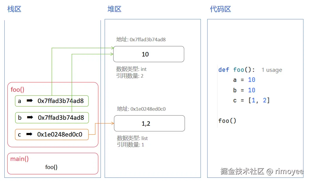 如下图所示, 在堆区中, 每个对象都包含一个引用计数, 用于统计当前对象被引用的次数。当引用计数为0时, 该对象被垃圾回收机制回收。