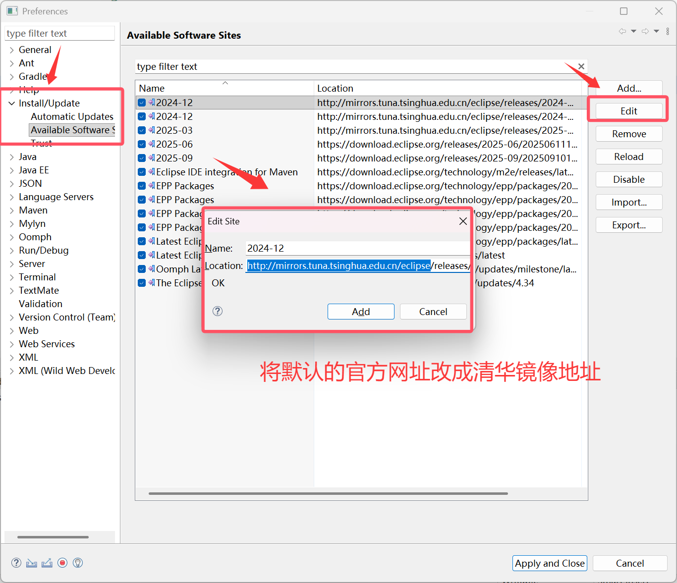 1.eclipse中添加镜像,eclipse中找到windows----prefrences。