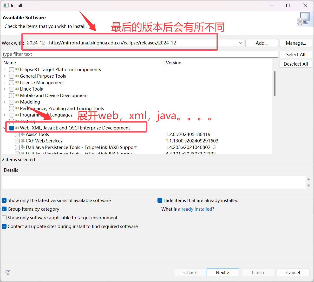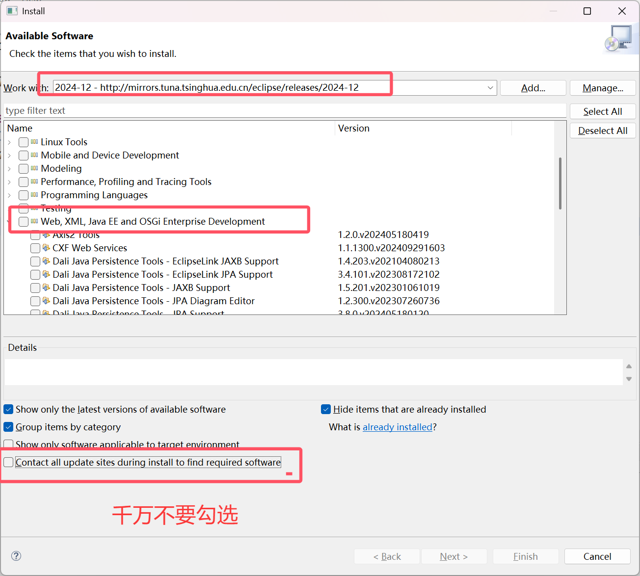 展开 "Web, XML, Java EE and OSGi Enterprise Development" 选项,并且将下面六个选项打上勾: