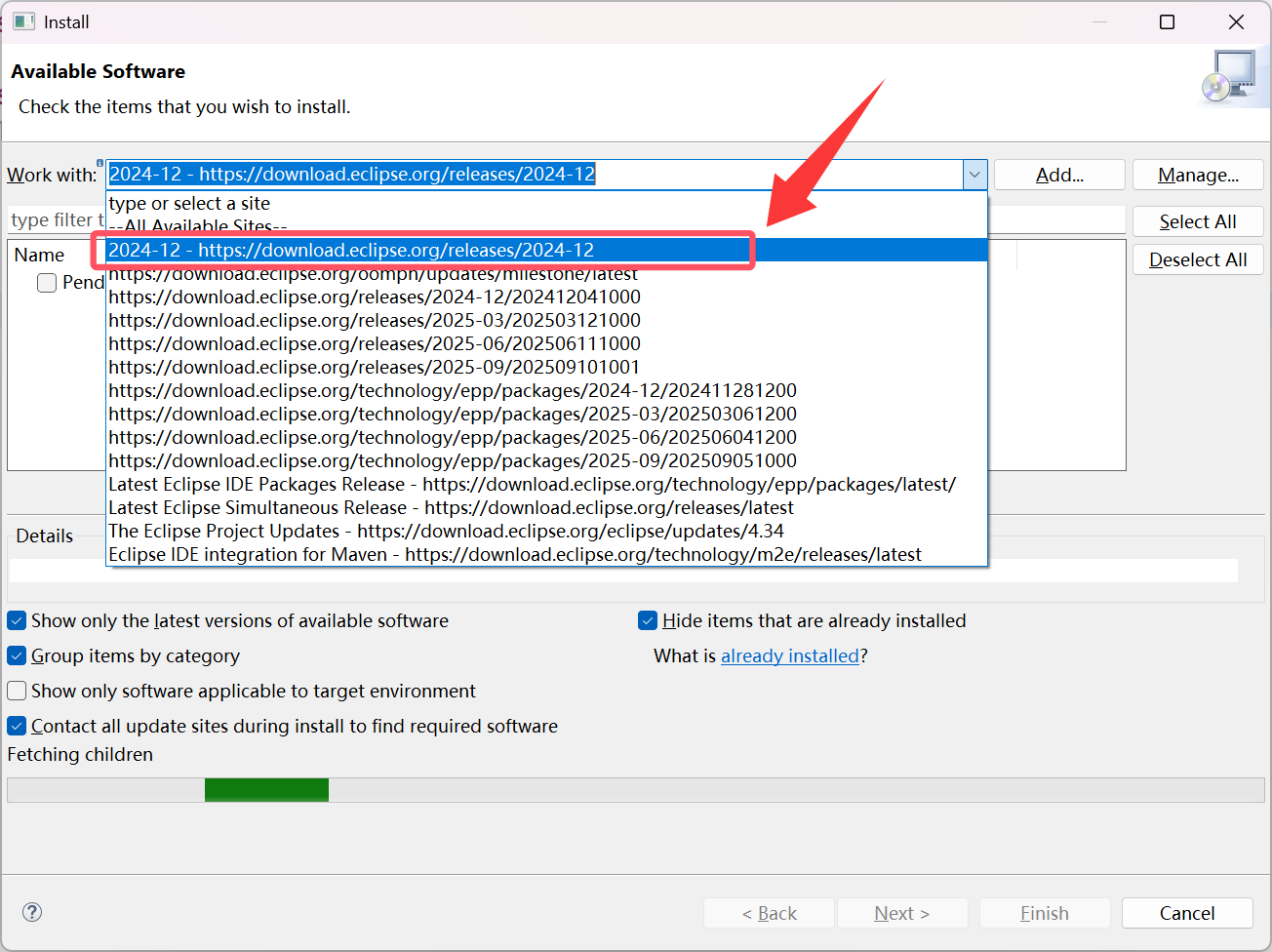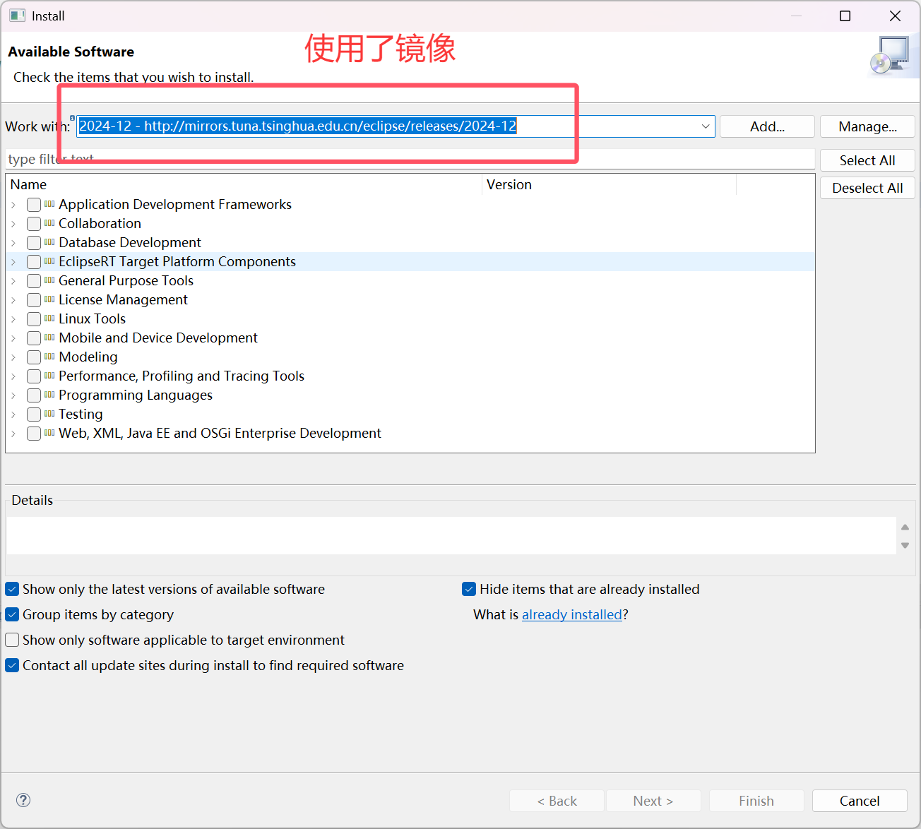 这里勾选的最后一项 Contact all Update sites during install to find required software 会在安装过程中会进行搜索更新,然后导致插件安装速度变得很慢甚至出现安装错误,在安装过程取消勾选该项就可以了。