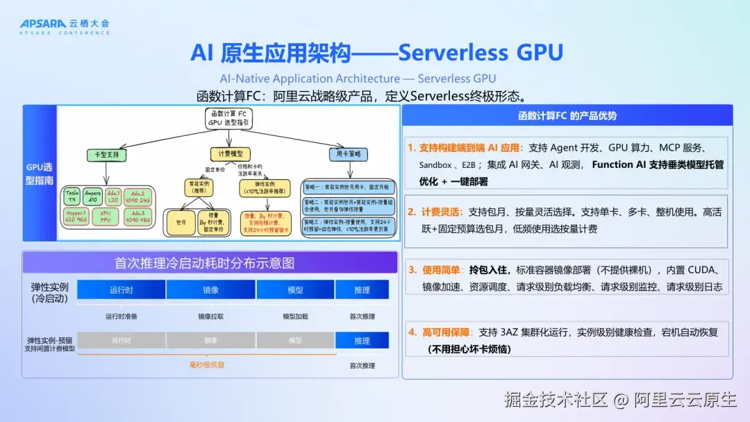 - 极致弹性 :GPU 实例启动快(毫秒级/秒级) ,通过请求感知调度显著降低 RT 抖动, 支持定时/水位伸缩、延迟释放、会话亲和。
