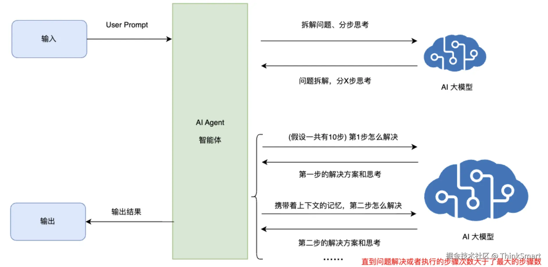 - 循环迭代:不断重复上述3个过程,知道任务完成或者达到终止条件(如达到最大思考和执行的步长)