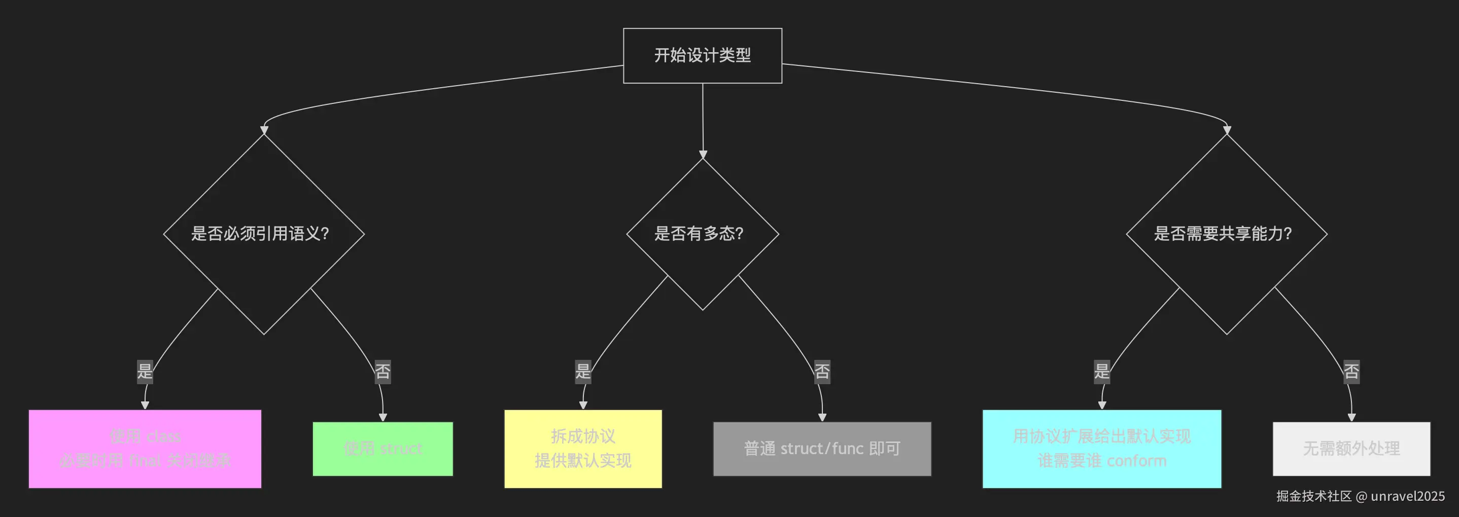 - 值类型无法参与:Swift 的 struct 不能继承 class。