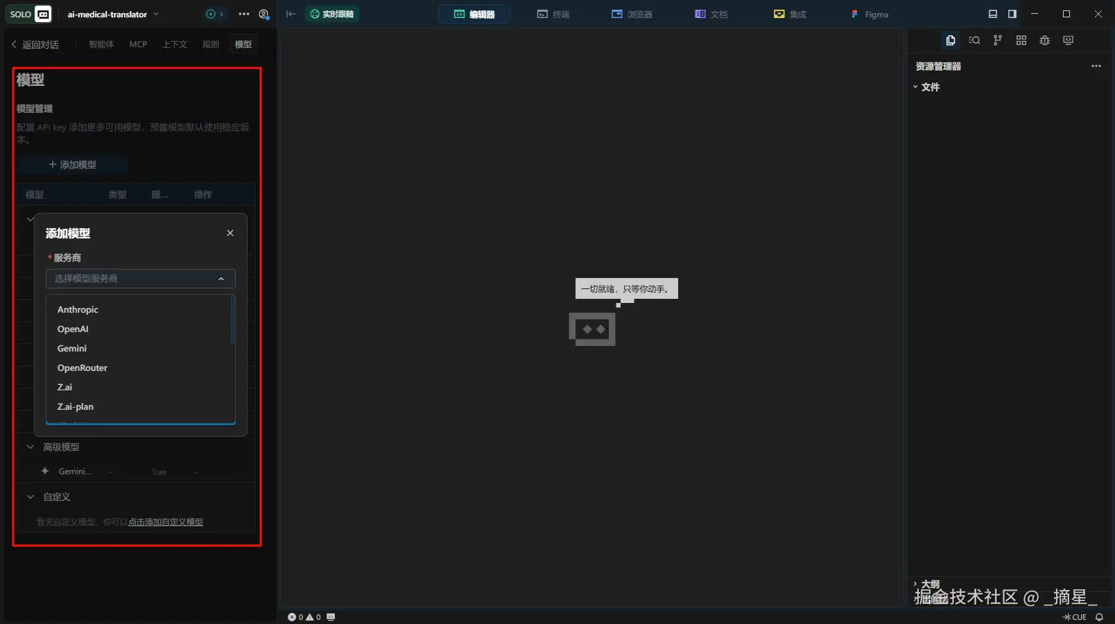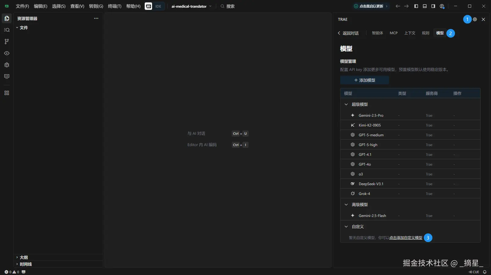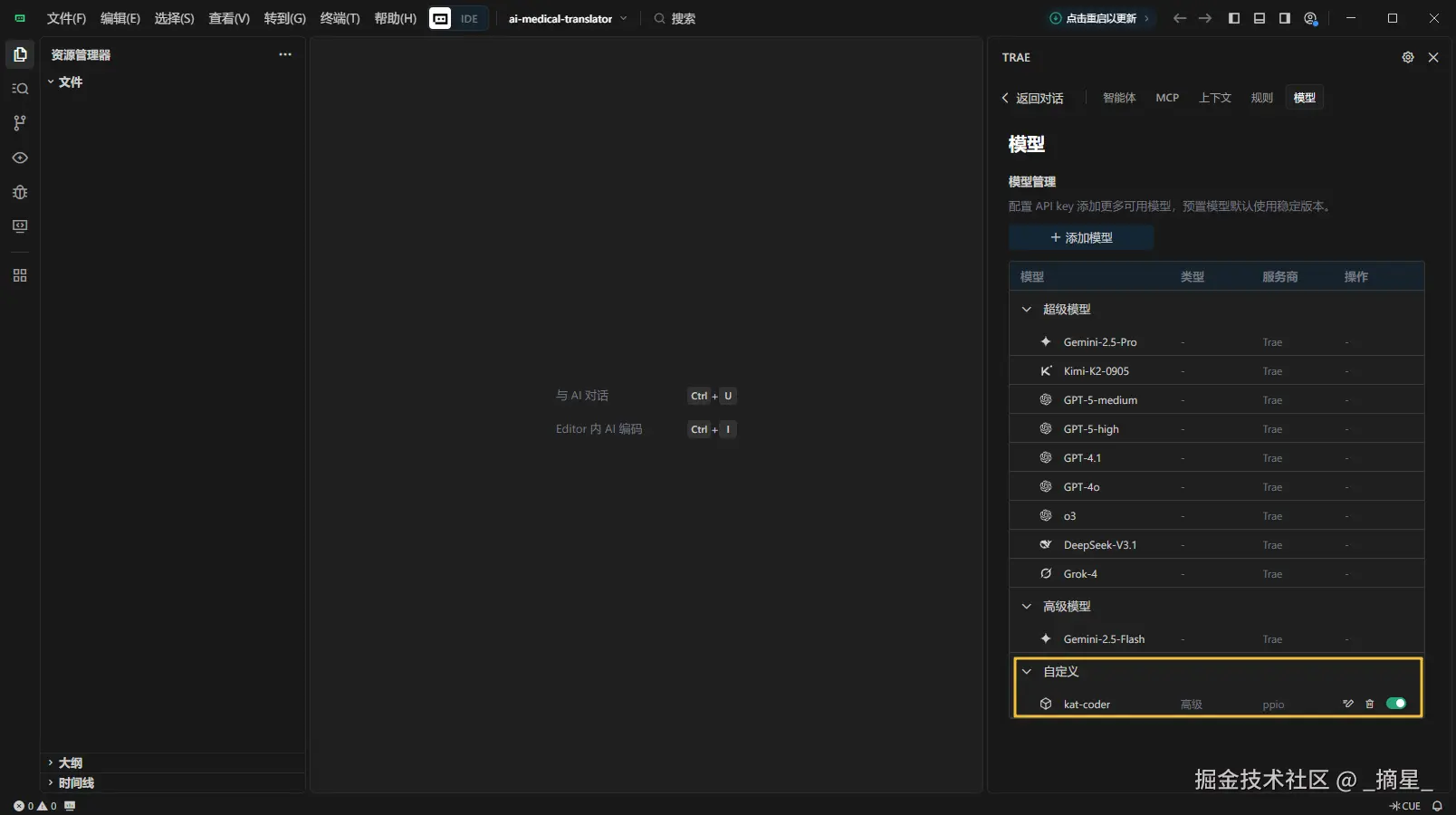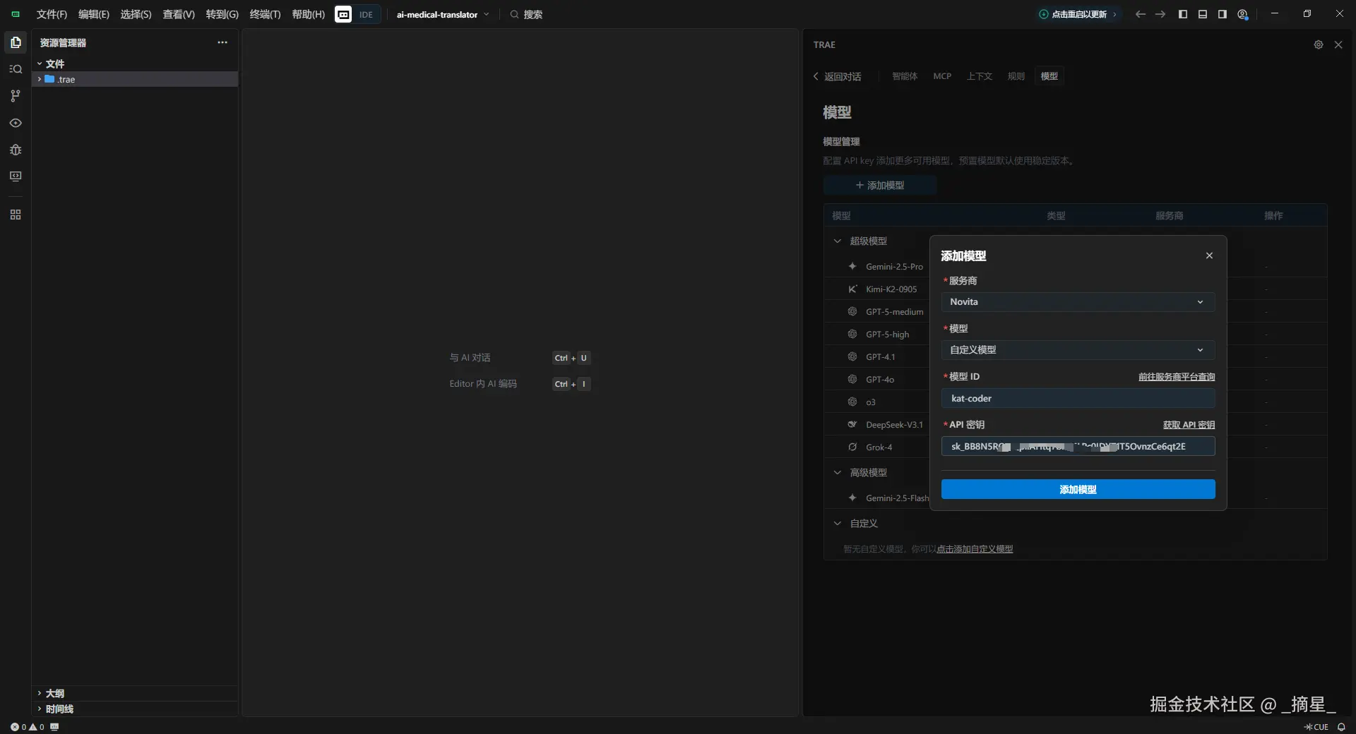 Trae对OpenRouter等开放平台的支持,这为开发者提供了更大的灵活性,使其能够根据具体需求选择和集成最适合的AI模型。 同时,社区正在积极推动对自定义模型服务商base_url的支持能力,这将进一步增强Trae在企业级应用中的适应性。这些特性使得Trae成为连接自定义AI模型(如KAT-Coder-Pro-V1)与专业应用场景(如医疗报告翻译)的理想桥梁,为我们的项目提供了坚实的技术基础。