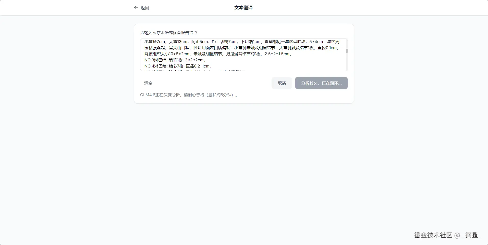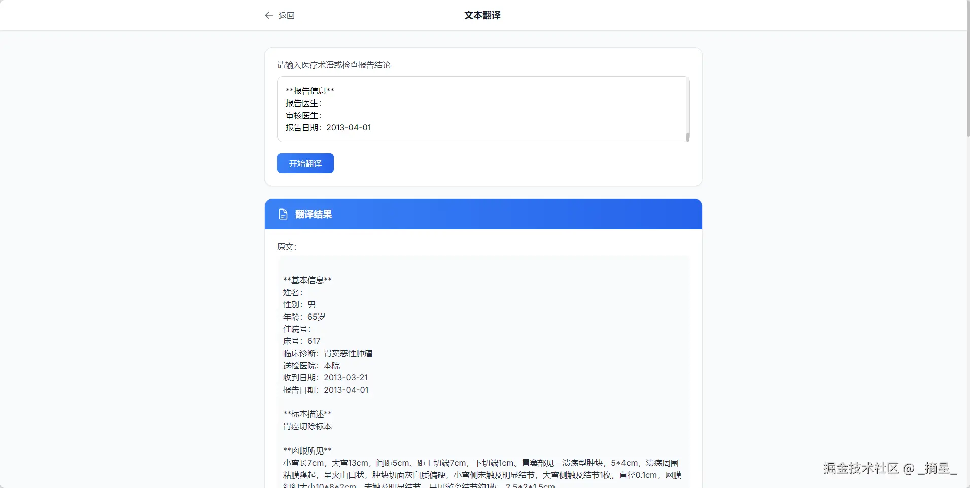 | 文本翻译页 | 输入区域 | 多行文本框输入医疗报告结论,支持粘贴和清空操作 |