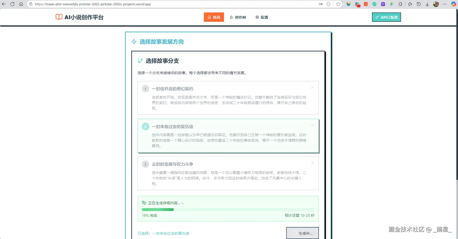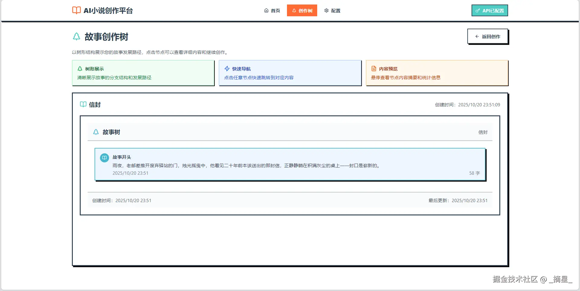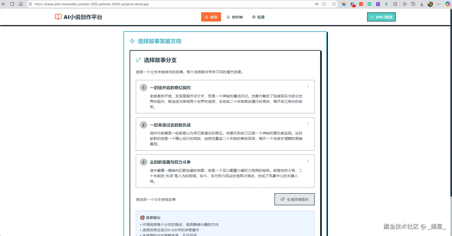 本项目深度融合 Trae Solo 的高效前端开发与任务调度能力,以及 GLM-4.6 在中文叙事、情节构建和风格一致性上的卓越表现,构建出"用户选剧情,AI写故事"的沉浸式创作闭环。用户只需输入一个故事开头,系统即刻生成三个风格各异的情节分支概览;选定其一后,AI将续写300--500字的高质量正文,并在此基础上持续衍生新分支,形成一棵动态生长的故事树。整个过程无需注册,API Key 通过本地存储安全保存,兼顾隐私与便捷。