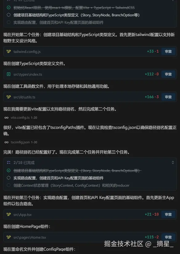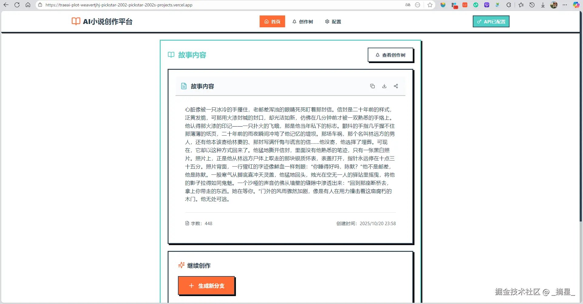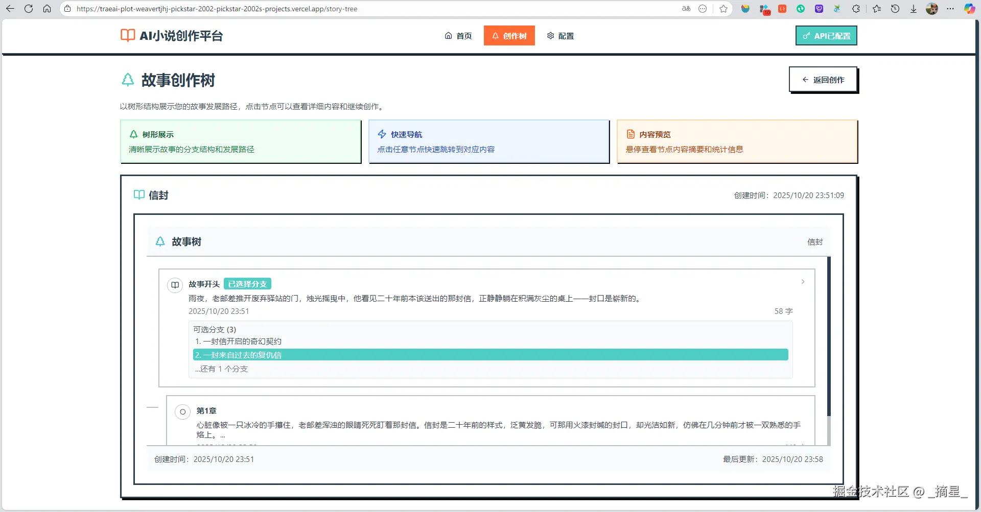 本项目深度融合 Trae Solo 的高效前端开发与任务调度能力,以及 GLM-4.6 在中文叙事、情节构建和风格一致性上的卓越表现,构建出"用户选剧情,AI写故事"的沉浸式创作闭环。用户只需输入一个故事开头,系统即刻生成三个风格各异的情节分支概览;选定其一后,AI将续写300--500字的高质量正文,并在此基础上持续衍生新分支,形成一棵动态生长的故事树。整个过程无需注册,API Key 通过本地存储安全保存,兼顾隐私与便捷。
