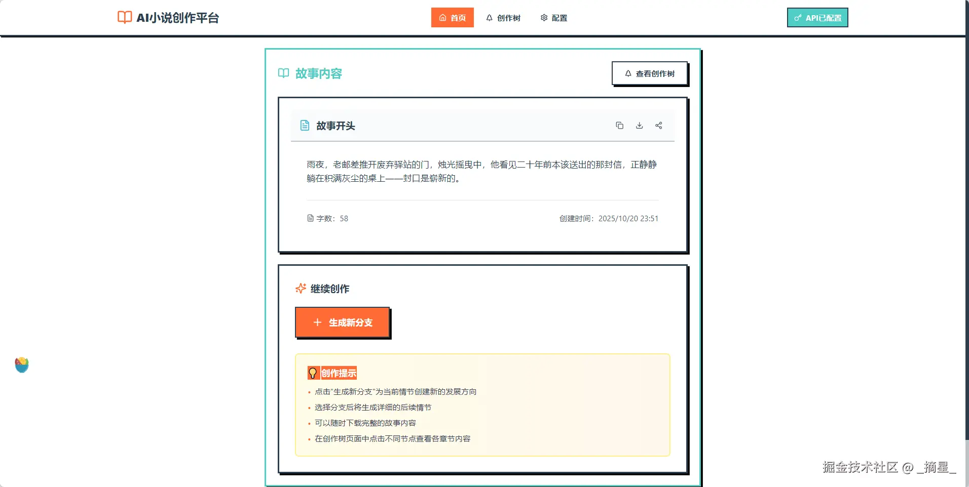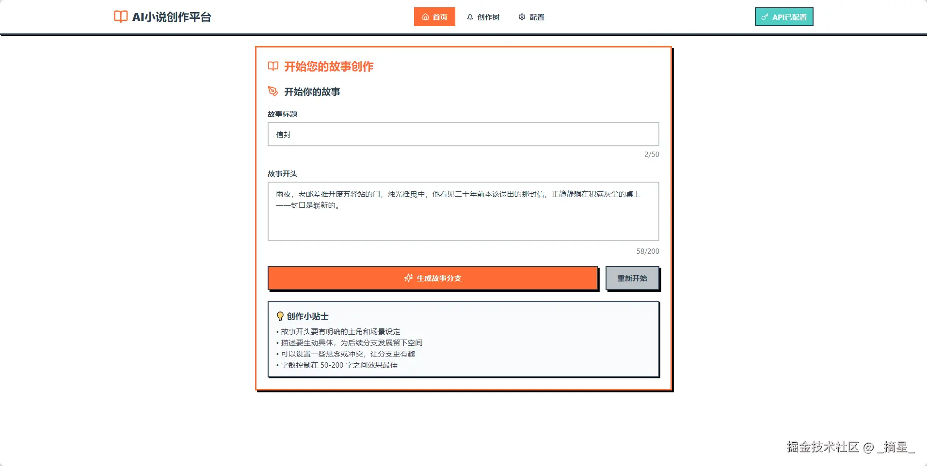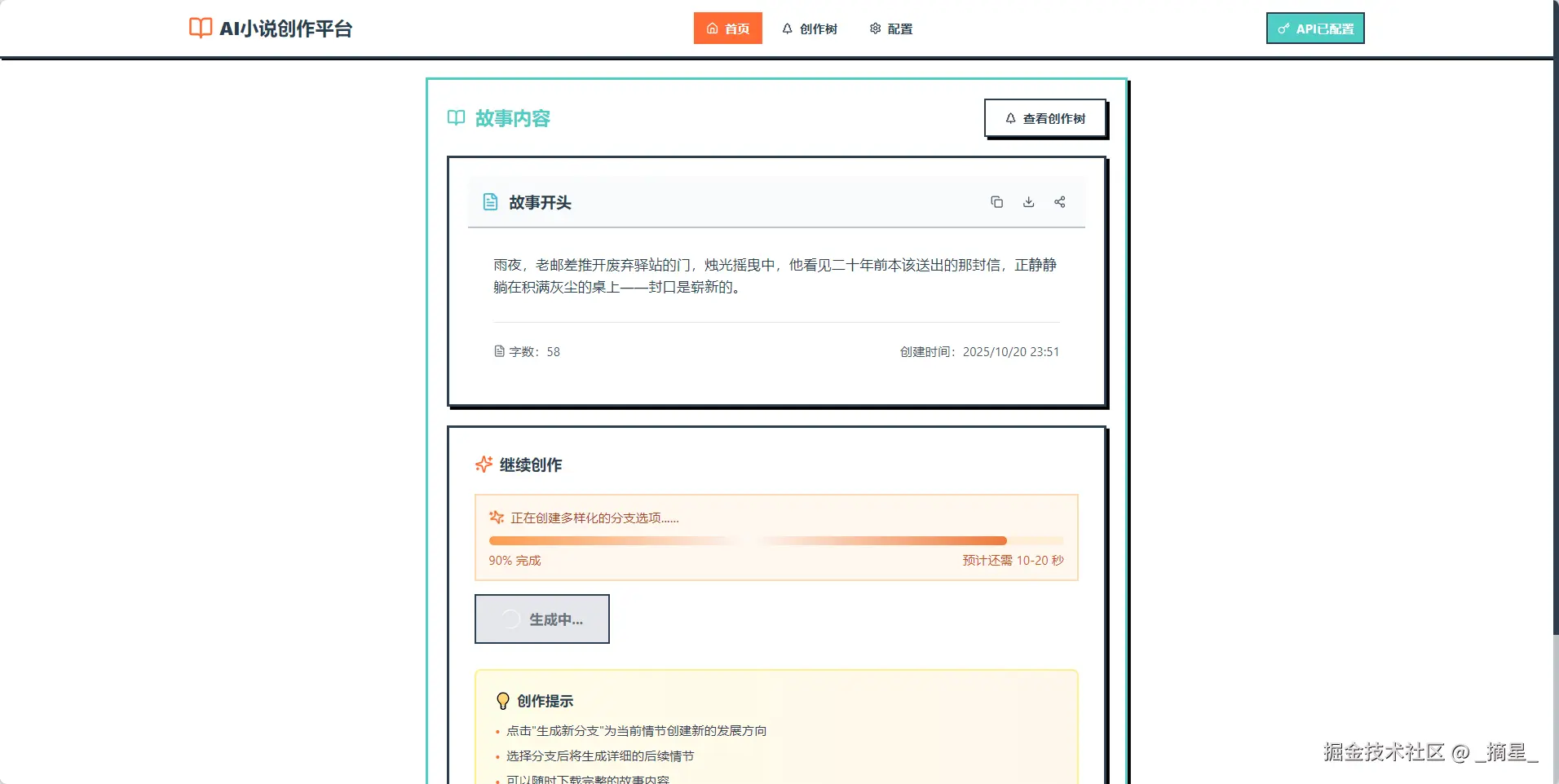 在"AI小说创作平台"这一应用中,我们正是依托 Trae Solo 的高效调度能力,结合 GLM-4.6 在叙事生成、情节延展与风格控制上的强大语言建模优势,实现了从用户输入的故事开头到多分支剧情概览、再到沉浸式章节内容的端到端智能创作。通过本地化 API 管理与无登录轻量架构,智谱大模型不仅为写作者提供了低门槛、高自由度的创作杠杆,更重新定义了 AI 驱动下互动式小说生成的新范式。