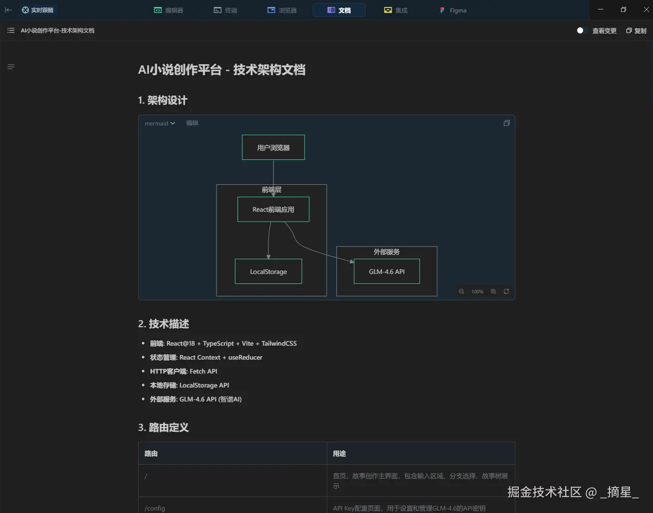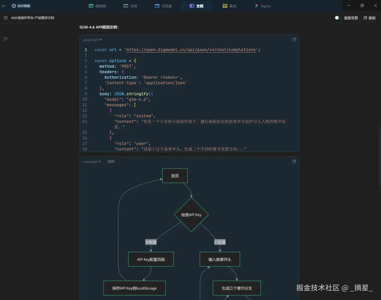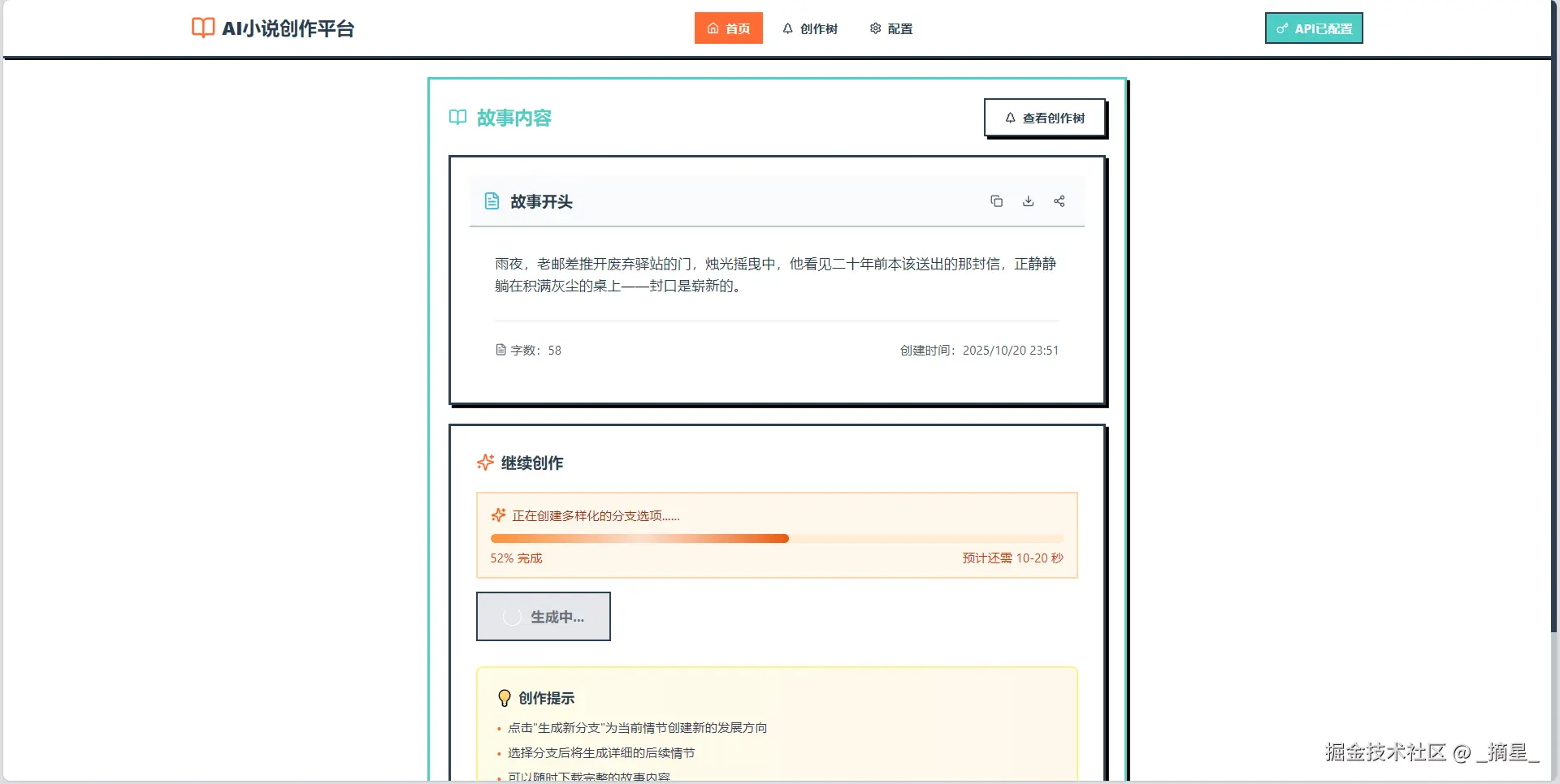 在"AI小说创作平台"这一应用中,我们正是依托 Trae Solo 的高效调度能力,结合 GLM-4.6 在叙事生成、情节延展与风格控制上的强大语言建模优势,实现了从用户输入的故事开头到多分支剧情概览、再到沉浸式章节内容的端到端智能创作。通过本地化 API 管理与无登录轻量架构,智谱大模型不仅为写作者提供了低门槛、高自由度的创作杠杆,更重新定义了 AI 驱动下互动式小说生成的新范式。
