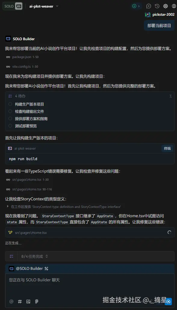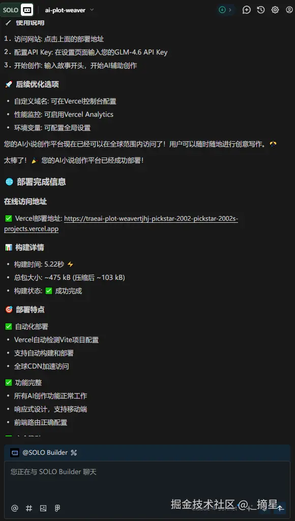 所有的功能都按照自己的想法开发完毕之后,就可以进入到部署阶段。在 Trae Solo 中,Vercel 被深度集成作为默认的前端部署与托管平台,极大简化了从开发到上线的全流程。开发者只需在 Trae Solo 项目中完成基础配置(如框架类型、构建命令等),即可通过内置的 "Deploy to Vercel" 一键发布功能,将 React、Next.js 等现代前端应用快速部署至全球 CDN 网络。Vercel 提供的自动 HTTPS、边缘函数支持、预览部署(Preview Deployments)以及环境变量管理,与 Trae Solo 的 AI 辅助开发理念高度契合------不仅加速了迭代速度,还确保了生产环境的稳定性与安全性。此外,Vercel 的无缝 Git 集成(支持 GitHub、GitLab 等)使得每次代码推送都能自动触发构建与部署,真正实现"写完即上线"。对于像 AI 小说创作平台这类轻量级、静态优先的应用,Vercel 的免费套餐已完全满足需求,是 Trae Solo 推荐的高效、可靠部署方案。Trae Solo