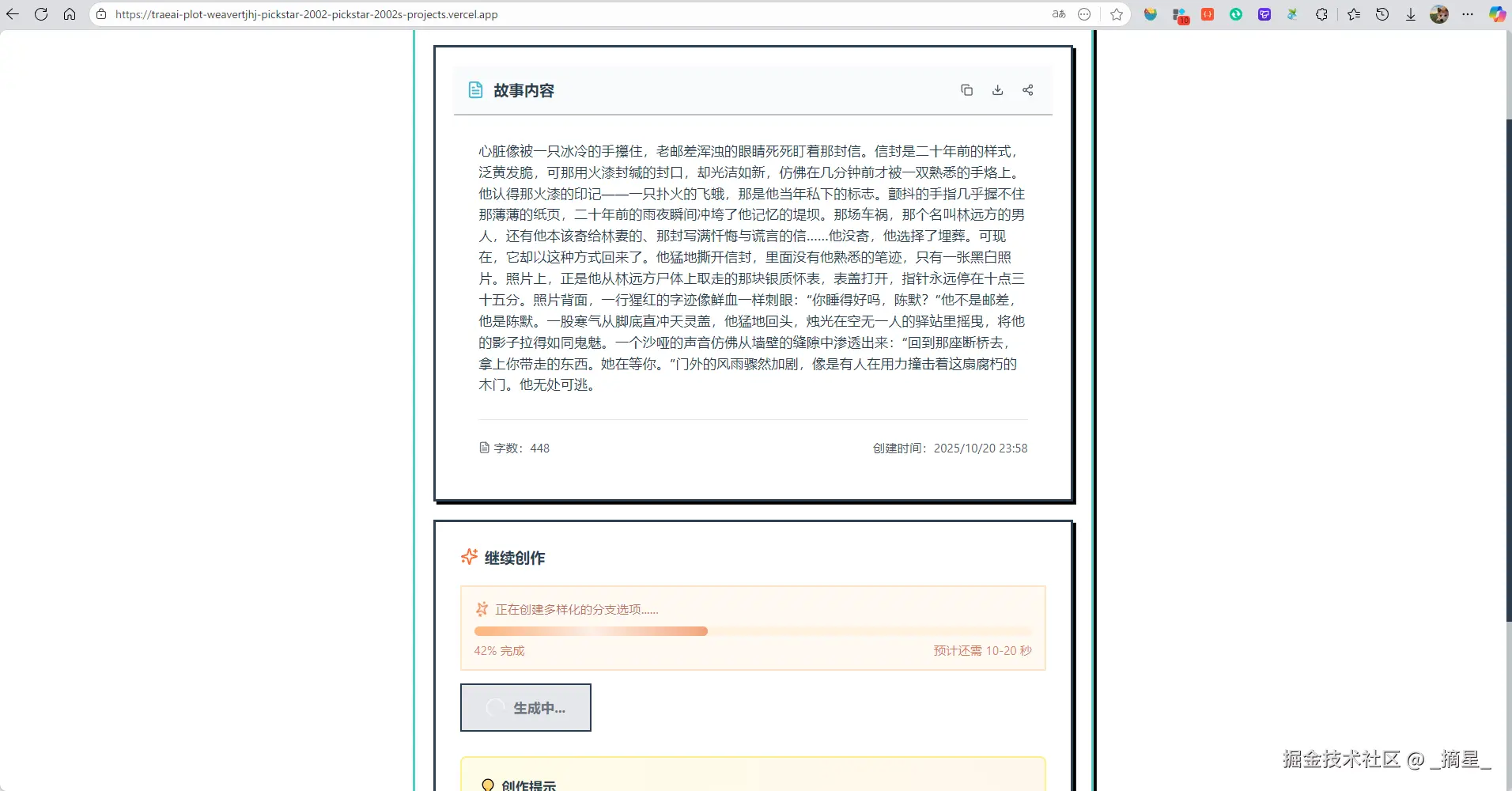 | 首页 | 详细情节生成 | 基于用户选择的分支调用GLM-4.6生成300-500字的详细情节内容 |