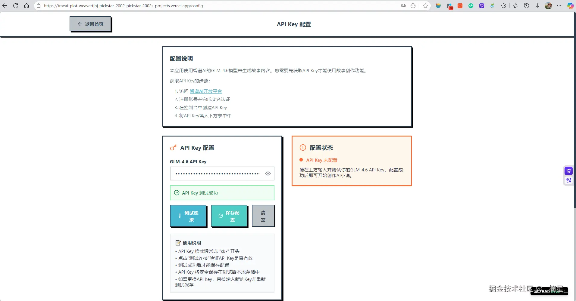 | API Key配置页面 | 本地存储 | 将API Key保存到localStorage,包含保存确认和清除功能 |