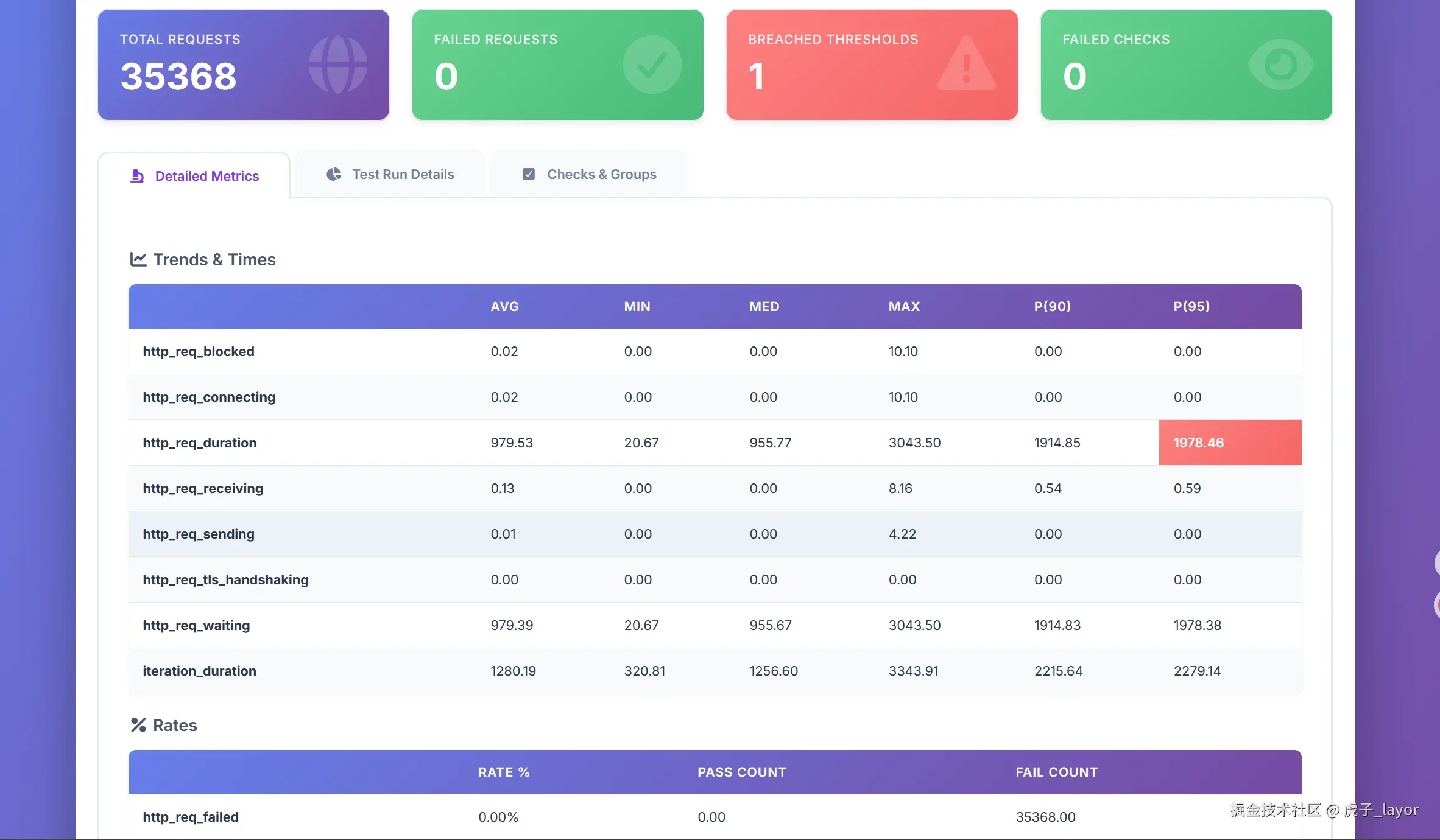- http_req_failed / checks:错误率与断言通过率;理想≈0%、≈100%。